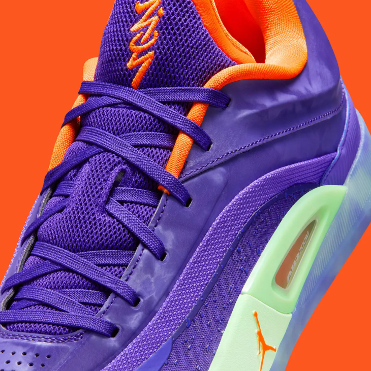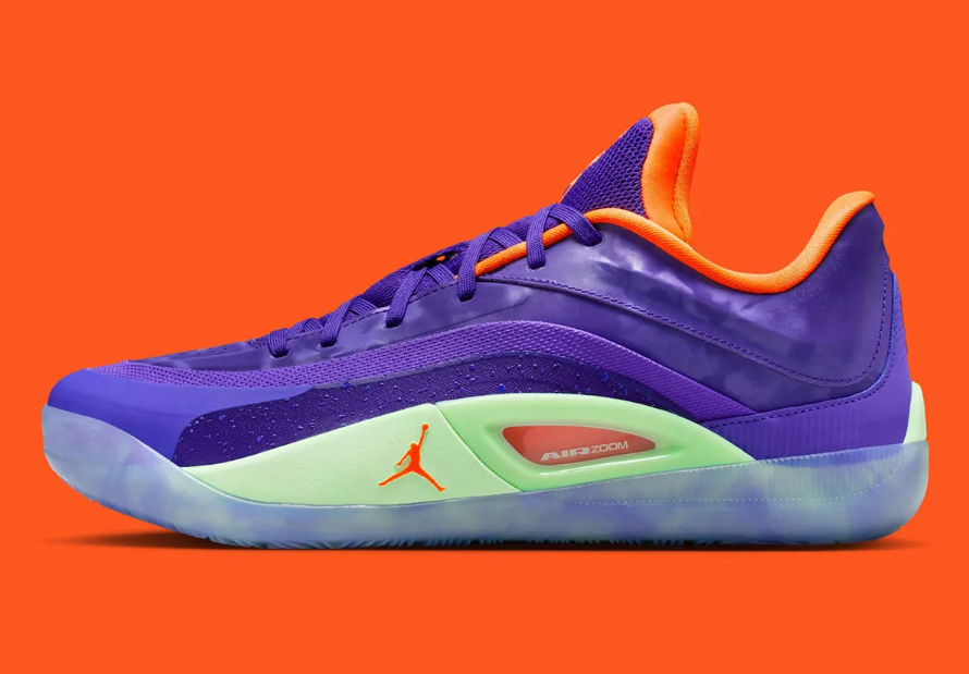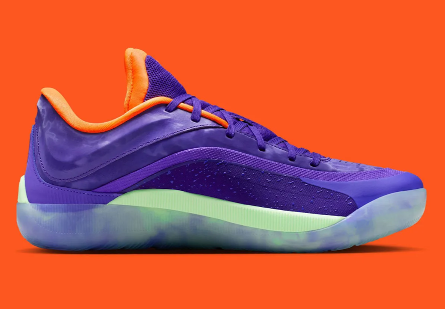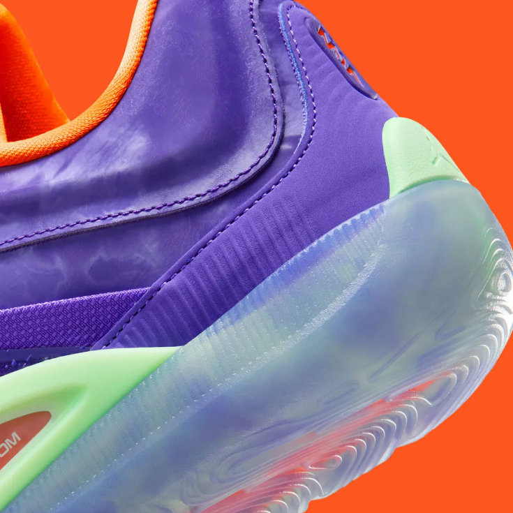 本文给大家带来的便是Jordan Zion 4即将发售的全新配色——「Rare Form」,该配色采用了紫色和橙黄色作为主色调,搭配上固定架的青绿色,使得整个鞋履的色彩层次非常丰富;搭配上充满韵味的半透明大底元素,毫无疑问从色彩层面来讲,这个配色的设计完全合格。