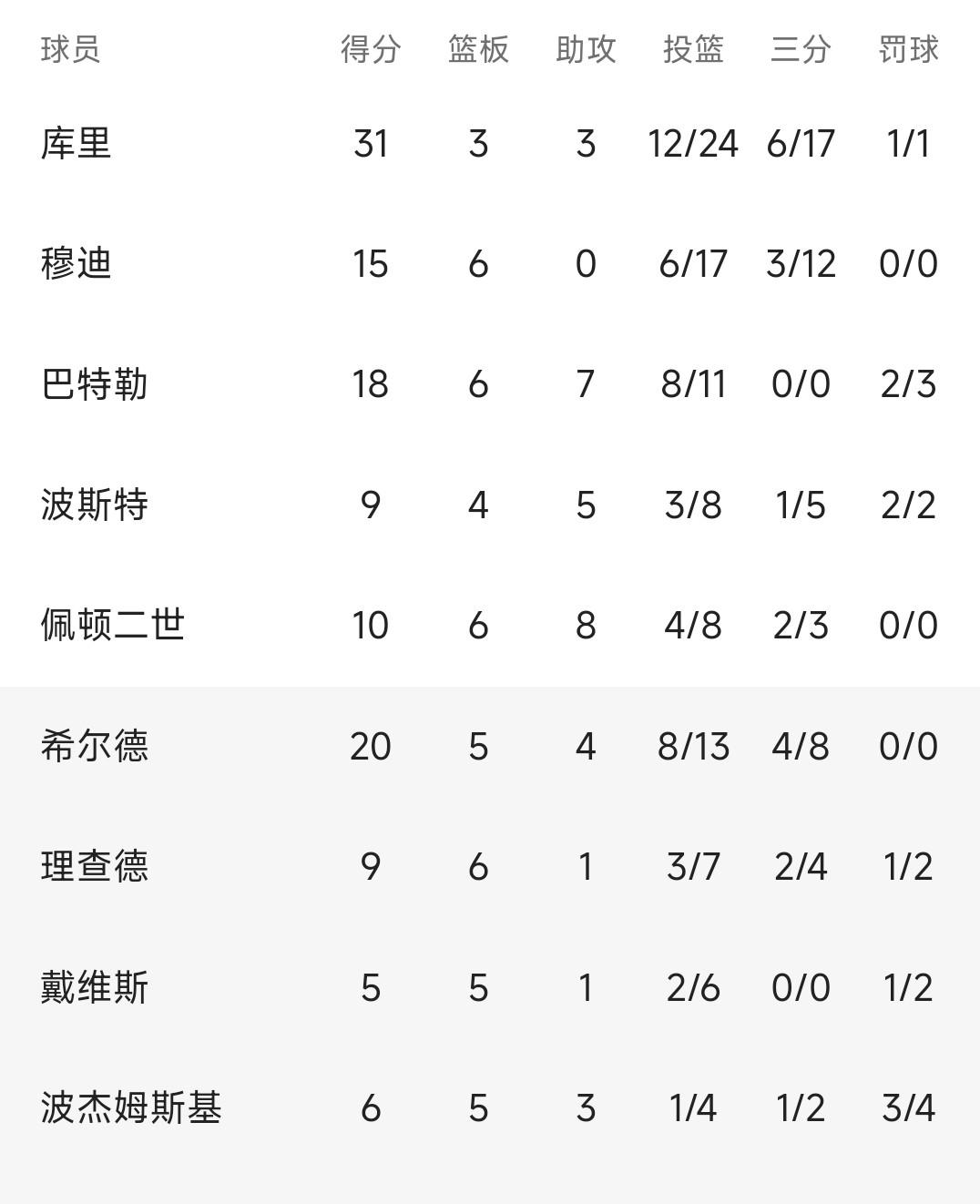 库里全场三分球17投6中,两分球7中6,拿到31分3篮板3助攻。巴特勒18分6篮板7助攻,穆迪15分,替补出战的希尔德拿到20分。