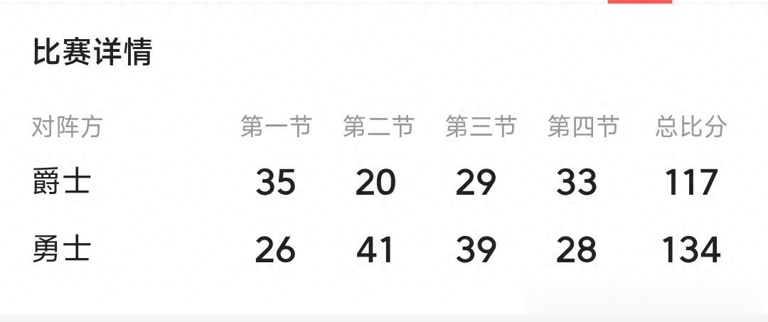 爵士这边,乔治砍下28分6篮板7助攻,马尔卡宁17分6篮板7助攻,贝利21分。爵士遭遇四连败,值得一提的是,爵士在最近五场比赛里让对手得分都非常高,150-147战胜公牛,126-140输给湖人,112-144输给雷霆,算上今天勇士的134分,爵士真是不防守!