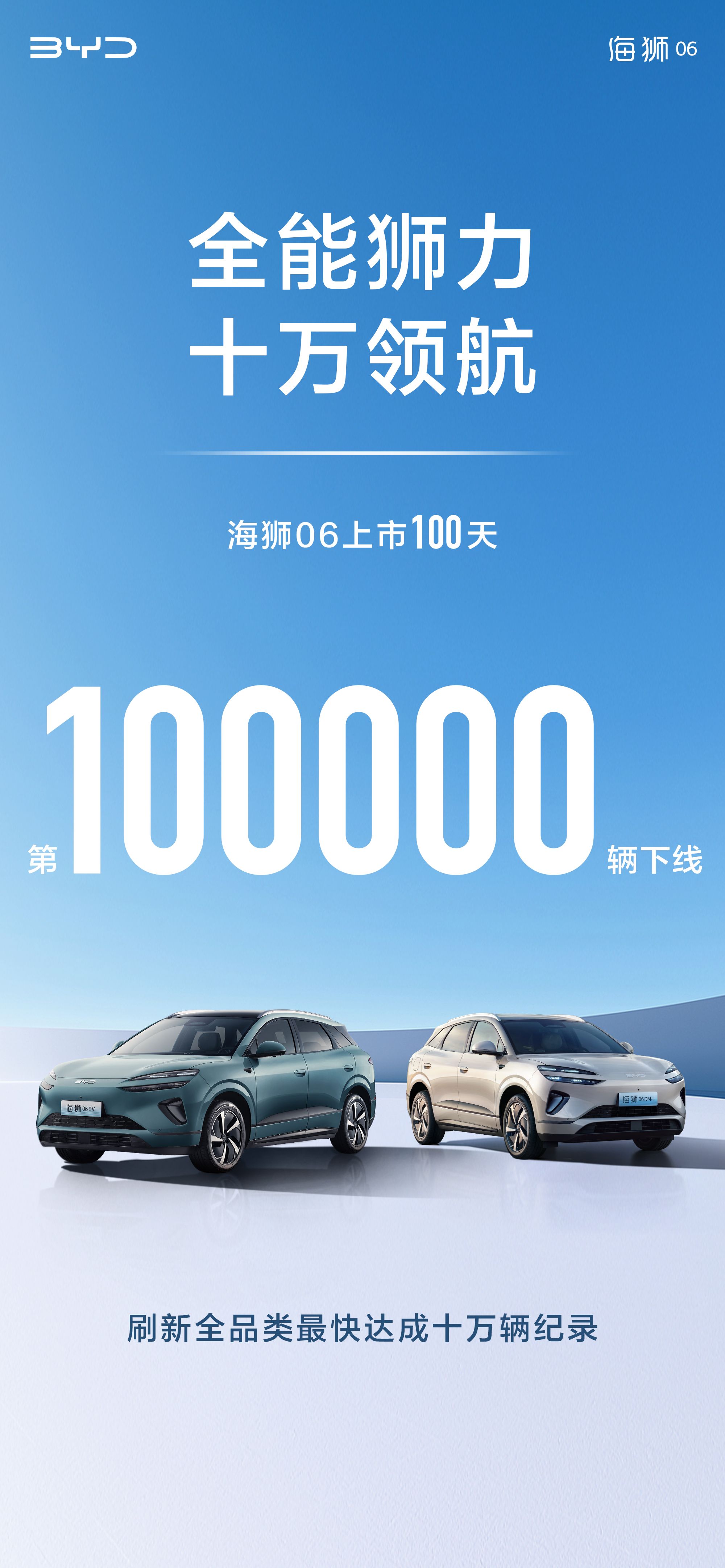 2025年10月31日 —— 今日,比亚迪海洋网旗下"高能超享SUV"海狮06迎来上市第一百天的里程碑时刻——第十万辆整车正式下线。这一成就标志着海狮06成为全品类车型中最快突破十万辆销量的现象级产品,以令人惊叹的"海狮06速度"为竞争白热化的主流SUV市场树立起全新价值标杆。上市即爆款,持续月销破3万诠释冠军实力