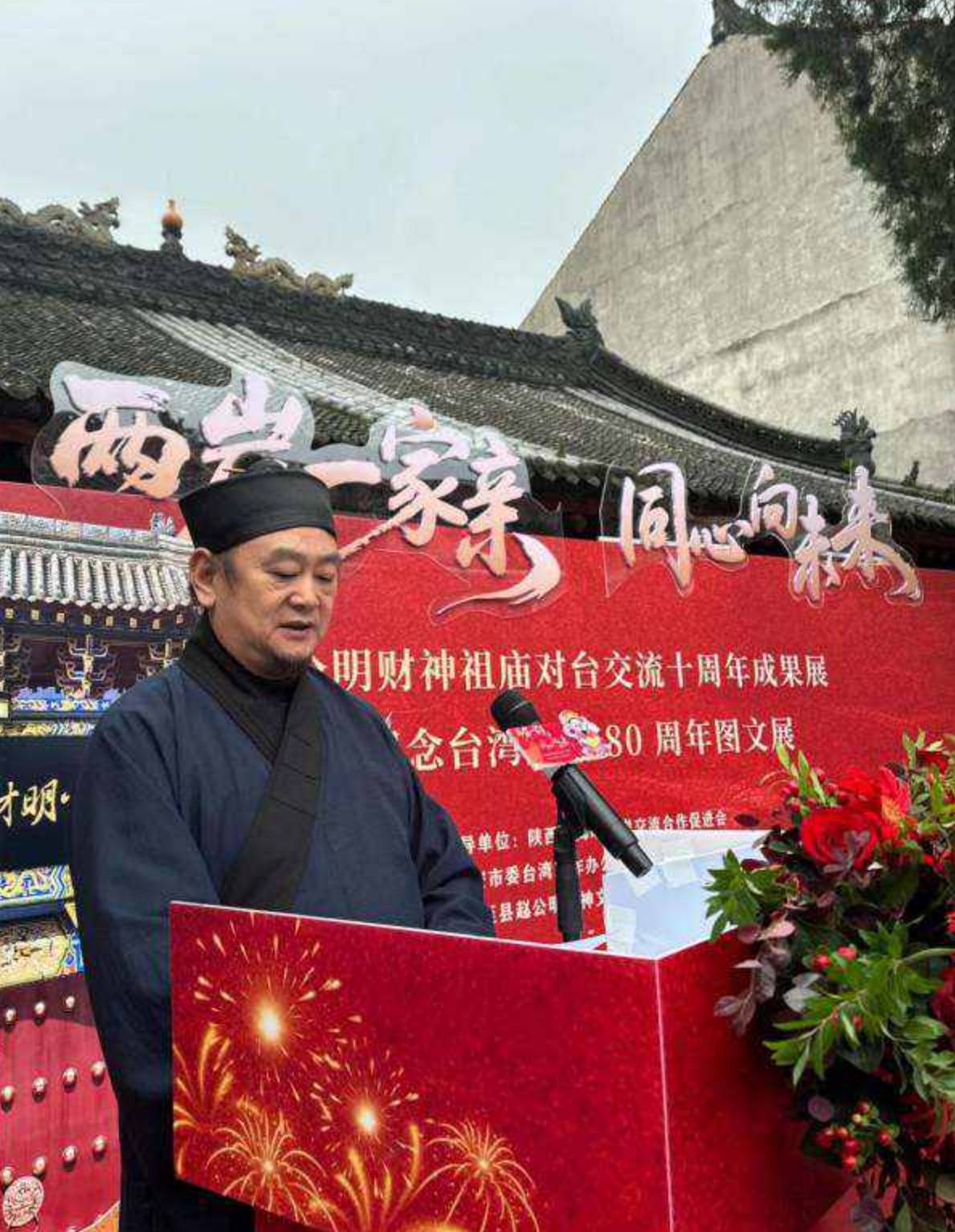 周至县赵公明财神文化发展促进会会长,周至县财神庙住持杜宗真在致辞中表示:站在十周年的节点上,未来的交流之路还有更广阔的天地。我们计划择机重启财神金身赴台巡安活动,让福气与文化认同继续播撒宝岛;将打造海峡两岸赵公明财神文化交流月等品牌活动,让更多台湾青年走进大陆、了解大陆发展机遇。过去十年,我们用文化铺就了连心桥;未来,愿我们继续以财神文化为纽带,同心同德、携手同行,让“两岸一家亲” 的理念深植 人心,为祖国和平统一贡献更多力量!
