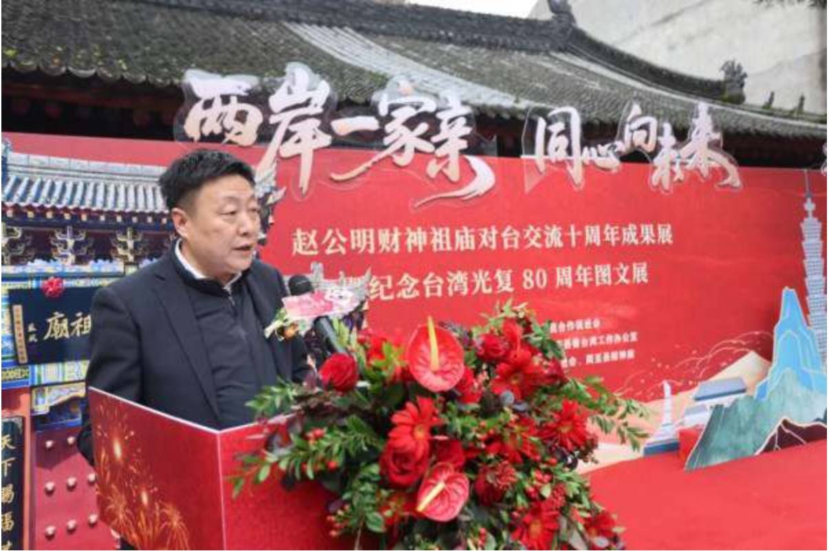 本次活动由陕西省海峡两岸交流合作促进会指导,西安市委台湾工作办公室、周至县委台湾工作办公室主办,周至县赵公明财神文化发展促进会、周至县财神庙承办。本次展览以“赵公明财神祖庙对台交流十周年成果展暨纪念台湾光复80周年”为主题,分设“金像巡台传福祉”“互访共续血脉情”“携手共筑连心桥”“同脉寻根谒祖庭”“并肩抗战卫山河”五个部分,以财神文化交流为切入点,通过图文、实物陈列等形式生动诠释了海峡两岸同文同种、血脉相连的骨肉亲情,命运与共的文化根脉。此次展览不仅展现了十年来陕台财神文化交流的丰硕成果,更通过历史影像与文物陈列,唤起同胞共同记忆,强化民族认同,进一步推动两岸民间互信与情感融合。