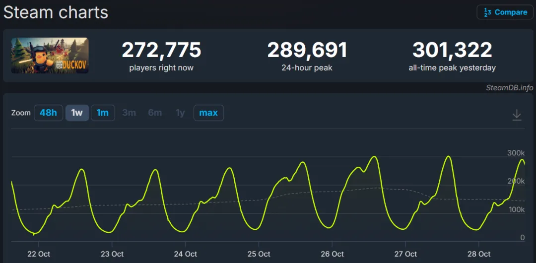 GameLook的数据显示,2025年10月16日,《逃离鸭科夫》登陆Steam、Wegame、EGS等平台之后,12天的全球累计流水已突破1亿元。
