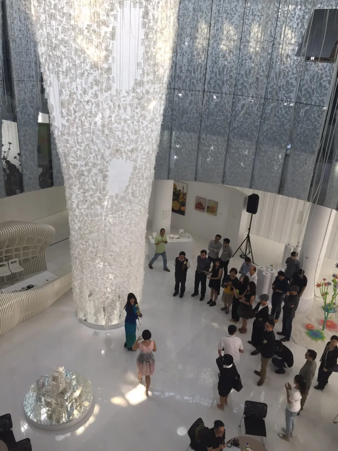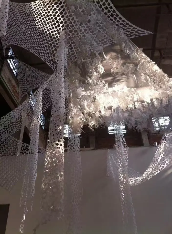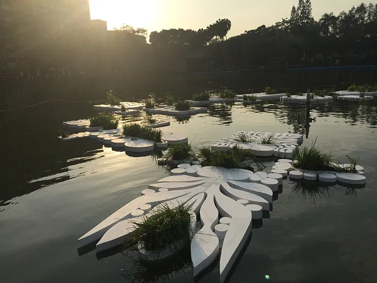 用水姑娘的原形图腾转换适合户外漂浮的材料,作为环境装弩,借助浮岛的概念,在水姑娘的本体上局部植入水生植物,宛若自然界漂浮在水面的巨大落花。