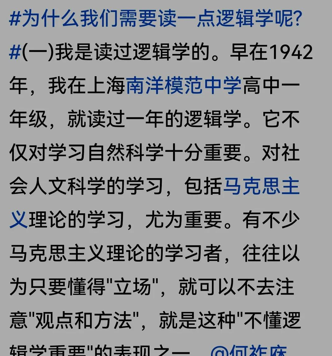 何祚庥院士说,1942年他在上海南洋中学读高中的时候,就读过逻辑学。逻辑学不仅对学习自然科学十分重要,对社会人文科学、尤其对马克思主义理论的学习至关重要。有不少马克思主义理论的学习者,往往以为只要懂得“立场”,就可以不去注意“观点和方法”,这是“不懂逻辑学”重要的表现之一。