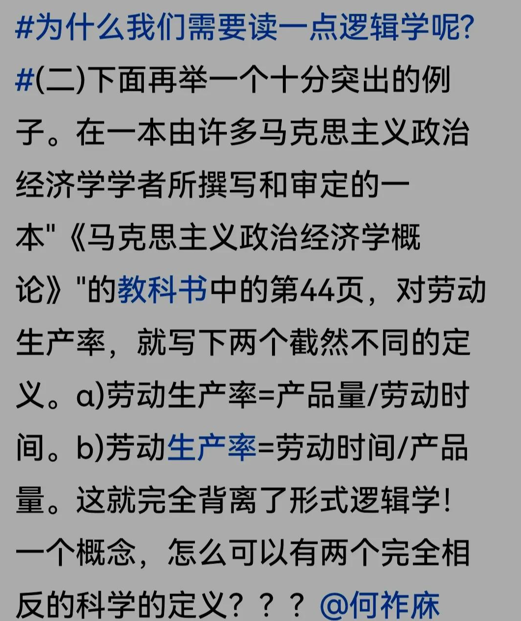 为此,何祚庥院士举了一个实例,《马克思主义政治经济学概论》的教科书中第44页,对劳动生产率,就有两个截然不同的定义:劳动生产率=产品量/劳动时间;劳动生产率=劳动时间/产品量。一个概念怎么可以有两个完全相反的定义呢?完全背离了基本逻辑。然而,有一位著名的马克思主义学者站出来严厉批评何祚庥:不懂得辩证逻辑!而何祚庥认为,在马克思主义理论中,从来不认可“辩证逻辑”是一种科学的逻辑学。