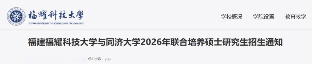 在10月23日发布的与同济大学联合培养硕士研究生的通知中也提到,为积极探索拔尖创新人才的培养机制,推进有中国特色、国际水平的高层次人才培养新体系建设,在教育部的支持下,福建福耀科技大学与同济大学开展2026年联合培养硕士研究生项目,合作培养拔尖科技创新人才。