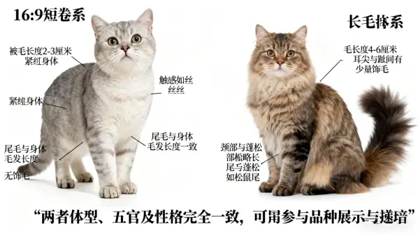 两者除被毛差异外,在体型、五官及性格上完全一致,均可参与品种展示与繁育。