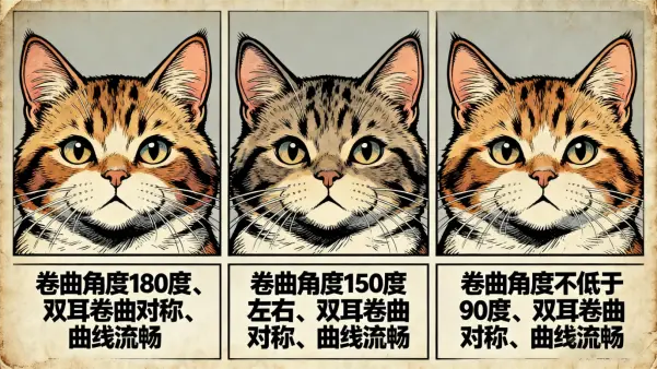 品质等级鉴别主要依据耳型卷曲角度:参展级需达到180度新月型,育种级 150 度左右,宠物级不低于 90 度,同时要求双耳卷曲对称,曲线流畅。