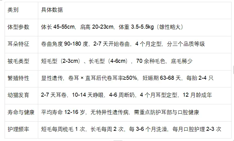 幼猫生长发育有清晰的时间节点:出生后1-3天耳朵直立,2-7 天开始出现卷曲迹象,1 个月时卷曲角度明显,4 个月耳型完全定型。眼睛通常在出生后 10-14 天睁开,21 天左右开始蹒跚学步,4-6 周断奶,3 月龄进入快速生长期,6 月龄达到性成熟,12 月龄完全发育为成年体型。