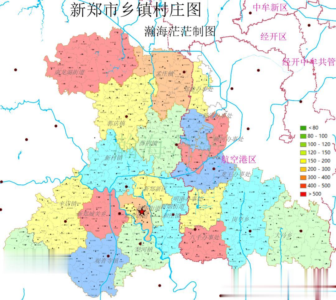 我们在乡镇地图的基础上加上村庄边界,加上行政村点位,就构成了新郑市乡镇村庄地图如下: