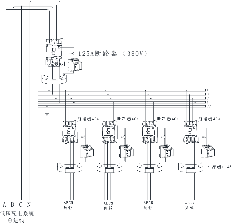 在被测的三相线路上与N线上各装一个CT,或让三相导线与N线一起穿过一个剩余电流CT,得到三相导线与中性线N的电流矢量和IA*+IB*+IC*+IN*,当没有发生单相接地故障时,无论三相负荷平衡与否,则此矢量和为零;当发生某一相接地故障时,故障电流中会通过保护PE及与地相关连的金属构件回到电源,即IA*+IB*+IC*+IN*,此时数值为接地故障电流Id。