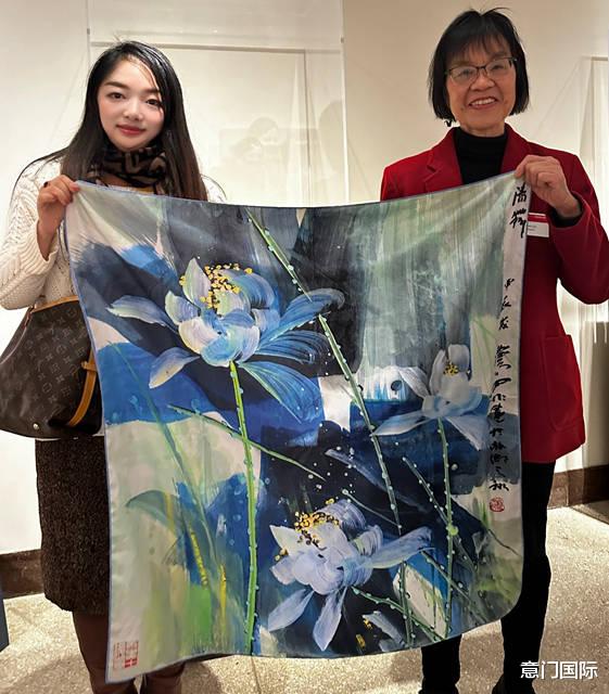 (图为师帅会长向美国国立亚洲艺术博物馆东亚文化研究所赠送湘西书画家雷雨田“中古荷魂”文创丝巾,右为美国国立亚洲艺术博物馆东亚文化研究所资深研究员刘嫄博士)