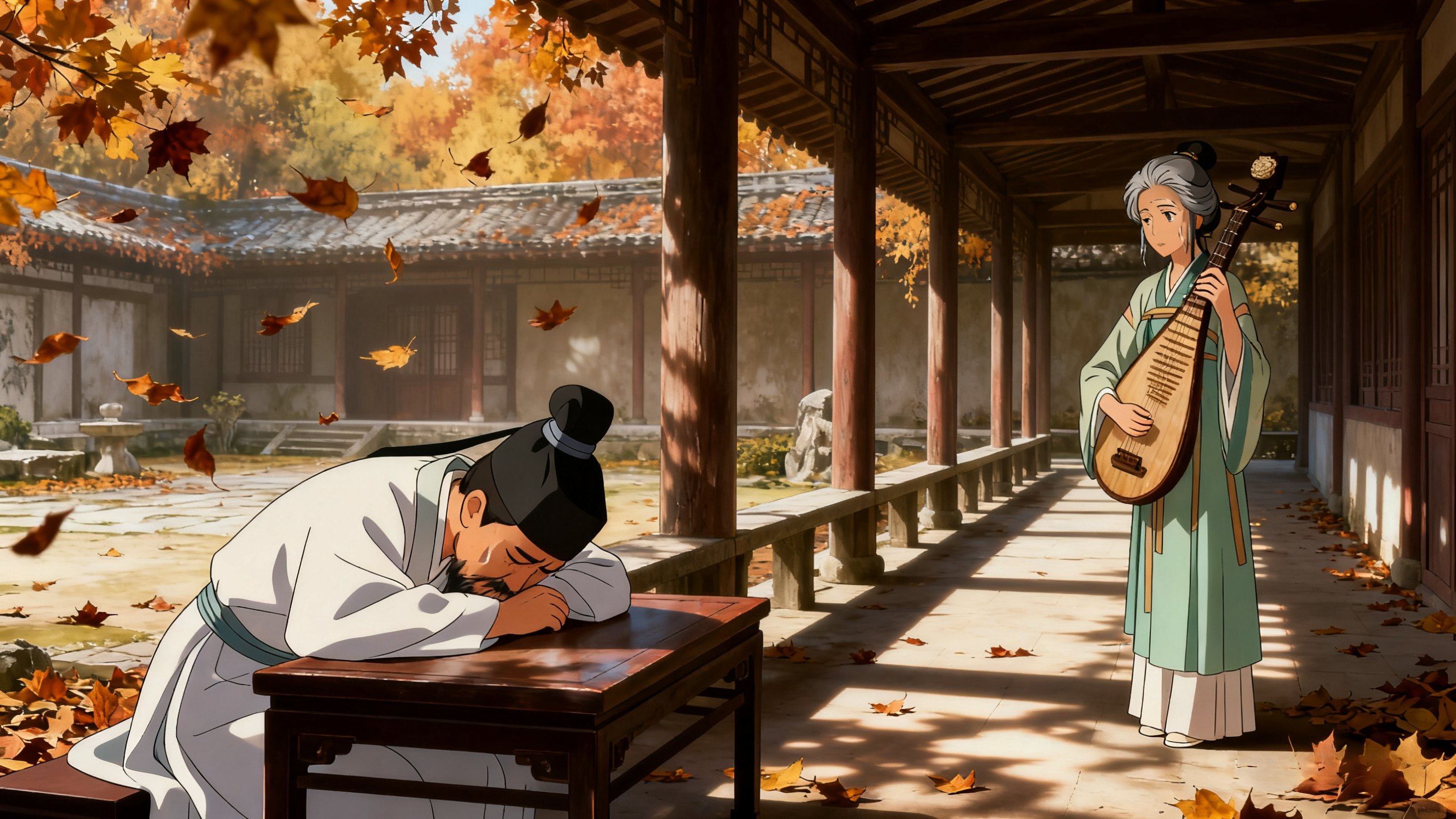 两人相对无言,唯有风穿过廊下。她轻轻拨弦,奏起少年时常听的曲子。白居易伏案痛哭,写下《感秋寄远》: