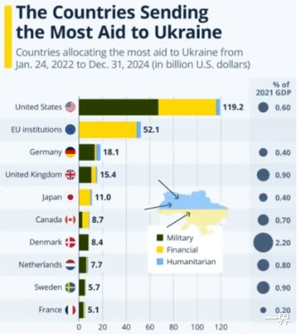 稍早前,特朗普和泽连斯基在白宫大吵架,美国对乌克兰的援助是否会中断的问题就表面化了。特朗普本就不支持对乌克兰的援助,他又是睚眦必报的人,对在白宫受到的“轻慢”不会轻易放过。正好,美国对乌克兰的援助眼下就有几十亿来自总统特批权限,当然是拜登在离任前特批的。但现在的总统是特朗普,既然总统有权特批,就有权取消。美欧对乌克兰战争的分歧已经彻底表面化了。欧洲还在嘴硬,宣称将继续支持乌克兰战争。泽连斯基直接从华盛顿飞往伦敦,并在那里得到英国的22.6亿英镑贷款,用于加强乌克兰的国防,这将用冻结的俄罗斯资产收益偿还。但这些援助显然是不够的。从2022年1月24日(战争爆发前夜,美欧已经因为战云密布而增加对乌克兰的援助)到2024年12月31日为止,美国援助共计1192亿美元,欧盟521亿美元,德国181亿美元,英国154亿美元,丹麦84亿美元,荷兰77亿美元,瑞典57亿美元,法国51亿美元。欧洲的援助总额与美国大体相当。