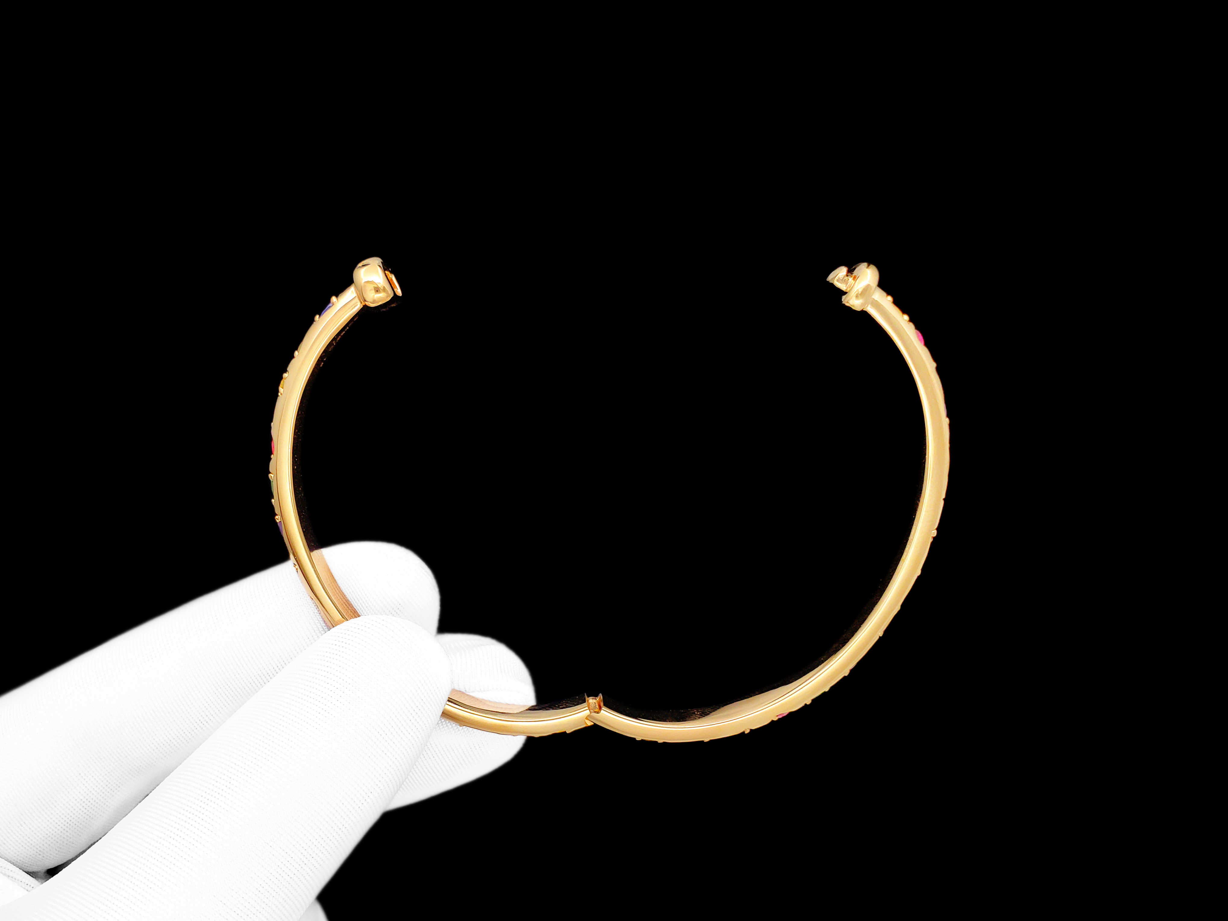 数据方面,手镯的宽度约为5.5mm,平均厚度超过3mm,其内部采用中空构造,因此整体重量并不大,这样的设计既确保了佩戴的舒适度,又凸显了高级珠宝的厚重质感,让人心生欢喜。