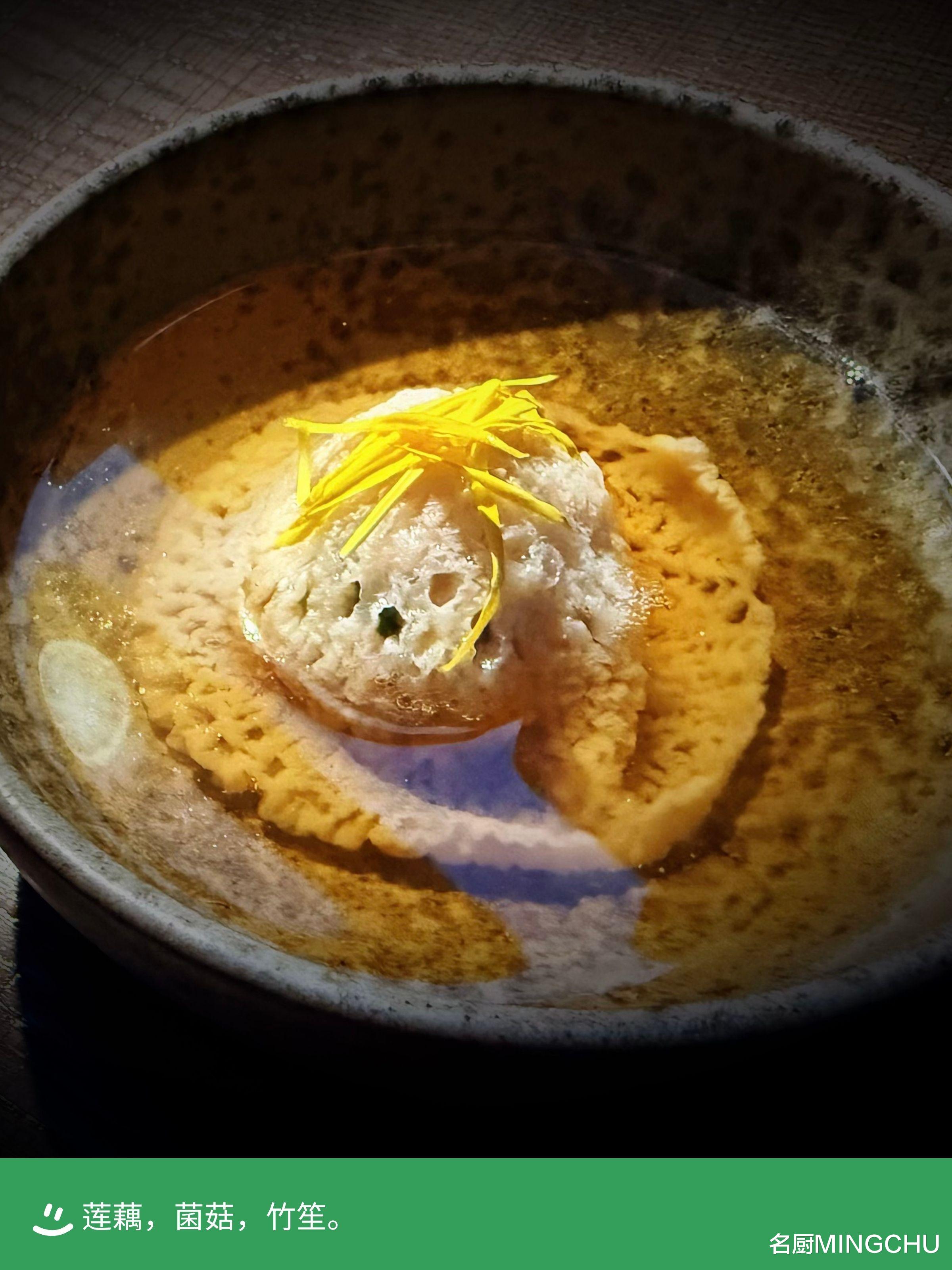 莲藕,菌菇,竹笙莲藕,春天种下,秋天成熟。这道汤品选用了江浙的莲藕,清甜、脆爽。戴师傅将其与马蹄一起做成藕丸子,外层用四川高山的长裙竹荪包裹,蒸制后外柔内糯,还带一点脆感,最上方点缀着几片菊花的花瓣,汤底是用云南野生松茸炖制而成。品尝时,先喝汤,再吃藕丸子,热乎乎的口感增添了一抹秋日温润。
