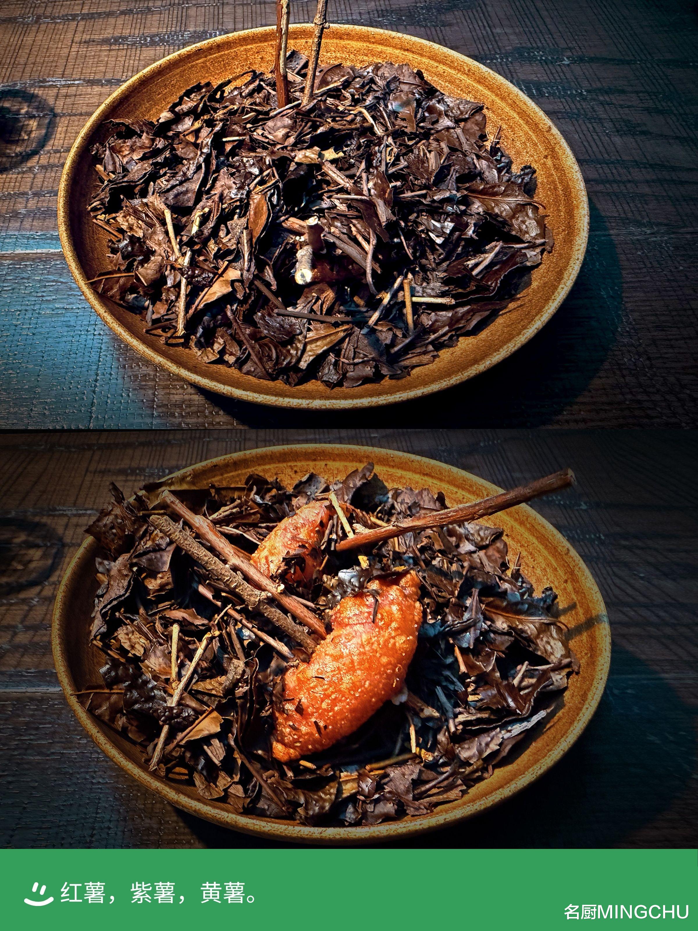 红薯,紫薯,黄薯拉开晚宴序幕的第一道开胃前菜,是由 Florilège 团队带来的美味小食。摆盘看似一碗秋日落叶,其实叶片是来自日本奈良吉野铭茶独特制作的番茶,其中藏着插有树枝的薯味料理。创作灵感源于川手主厨的儿时记忆,把红薯放到土中炙烤。这道红薯,紫薯,黄薯,也是用了同样的做法,但创意之处是将紫薯做成外皮,内馅包含了烟熏红薯,炸制后外层香脆且带有些许韧度,馅料细腻,滋味甘甜,富有香气和热度。