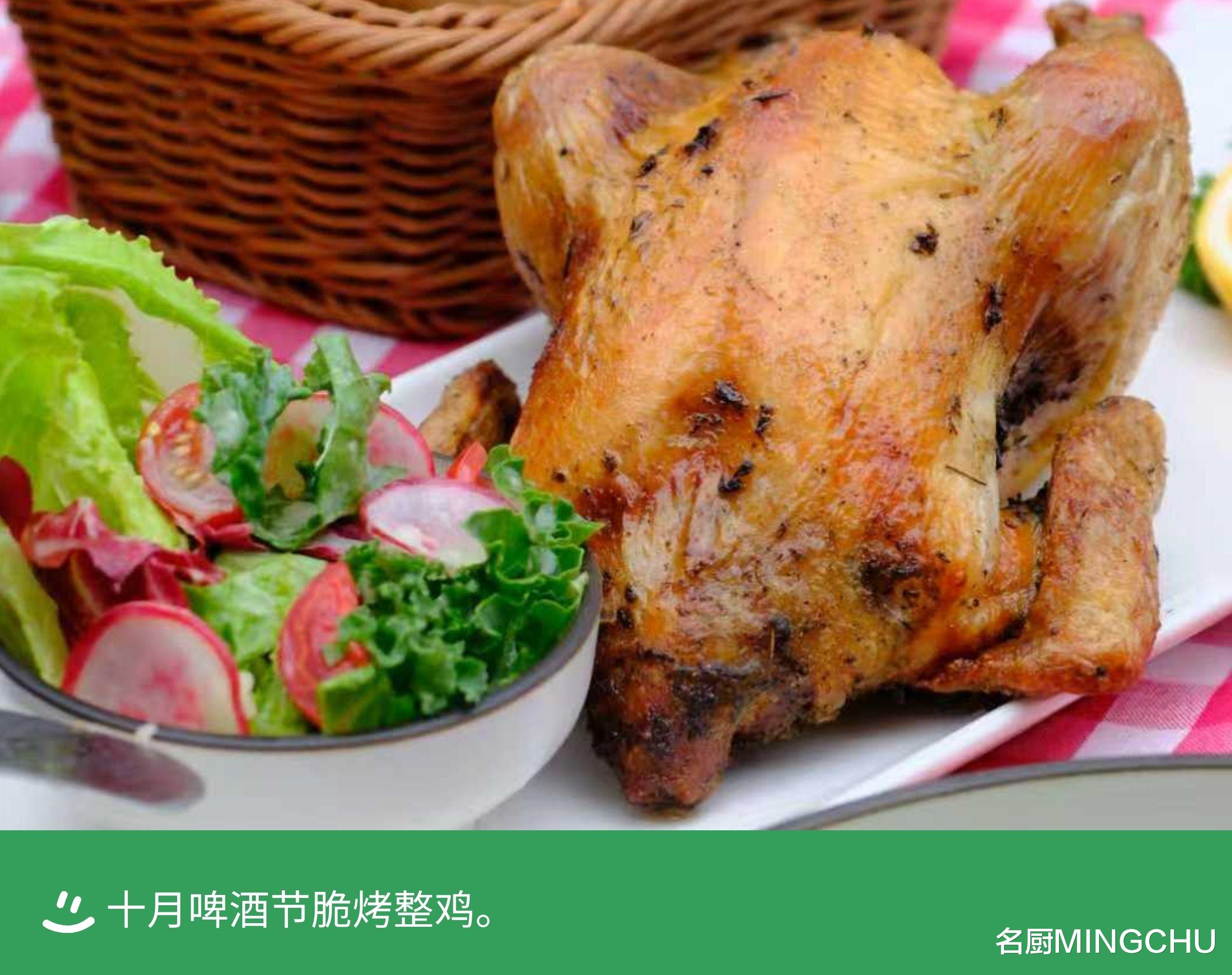 十月啤酒节脆烤整鸡这道外酥里嫩的整烤仔鸡是佐酒的不二之选:主厨将精选的小春鸡用大蒜碎、柠檬屑、香草和姜蓉调制成的腌料腌制一晚入味,采用真空低温烹制法 3 小时慢熟,让腌料的滋味充分进入肉中,并锁住鲜美的肉汁。最后入转炉烤至外皮金黄酥脆,内里鲜嫩多汁。
