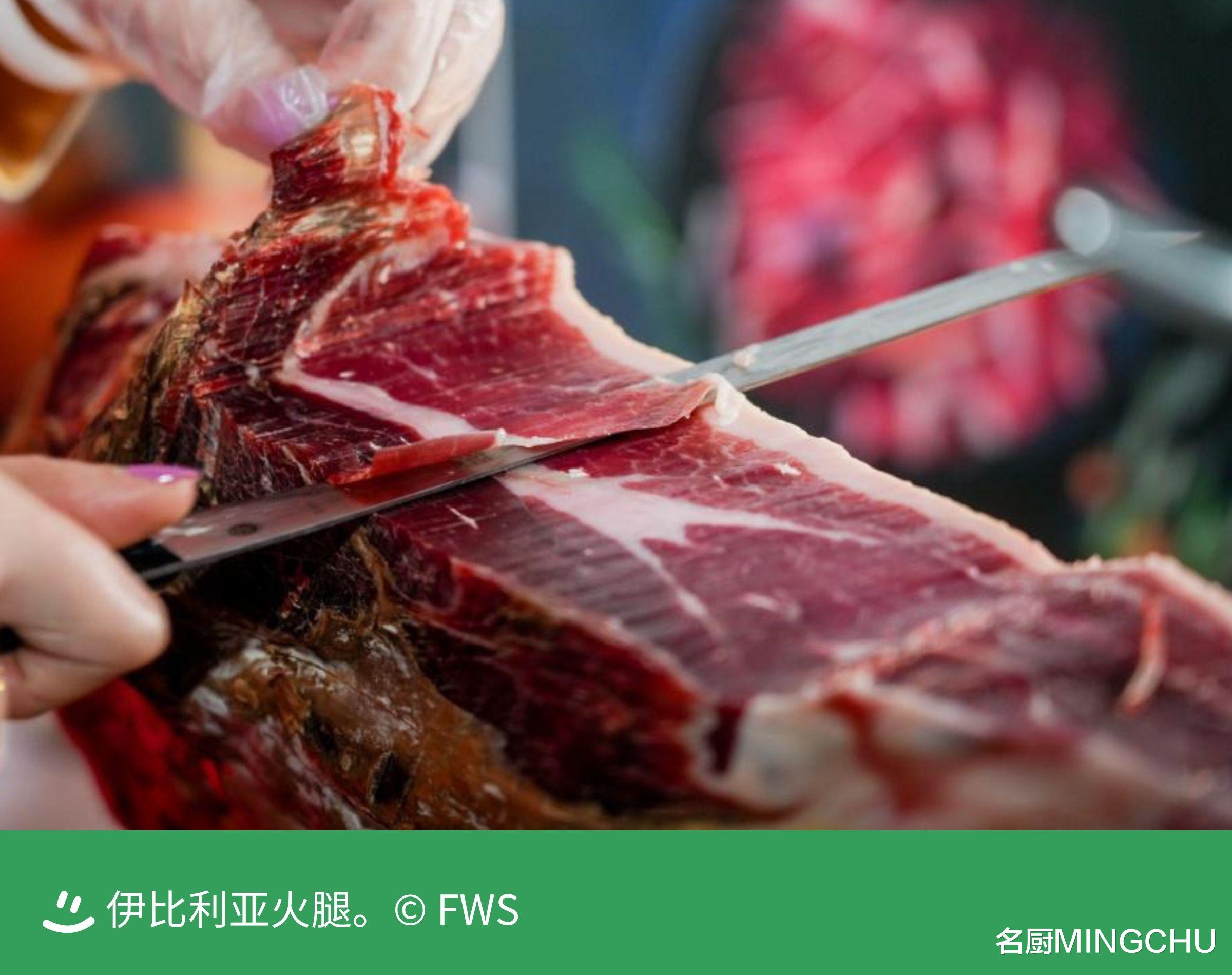 伊比利亚火腿伊比利亚猪肉产业联合组织(ASICI)特邀著名切片大师娄小娟现场演绎精湛的伊比利亚火腿切割艺术。娄小娟介绍道:“这是白标伊比利亚火腿,熟成时间为 24 个月以上,伊比利亚黑猪血统占比是 50%,圈养,以谷物饲料喂养为主。”摆盘精致的火腿切片,脂肪细腻,红肉风味温和。