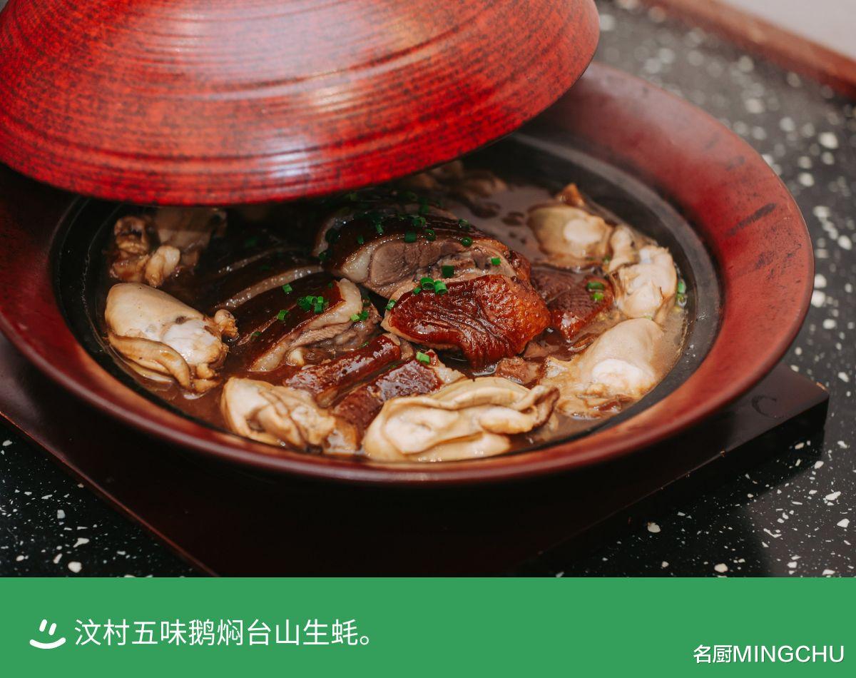 汶村五味鹅焖台山生蚝9 月底台山下川岛生蚝应季,只只肥厚、乳白细嫩。台山生蚝好在“无渣”之细腻感,非他处可比拟。非遗五味鹅是伍师傅的拿手经典名菜,他将当季生蚝做五味之外另一味加入其中,实乃“鲜咸味”,咸甜交融,更富层次。