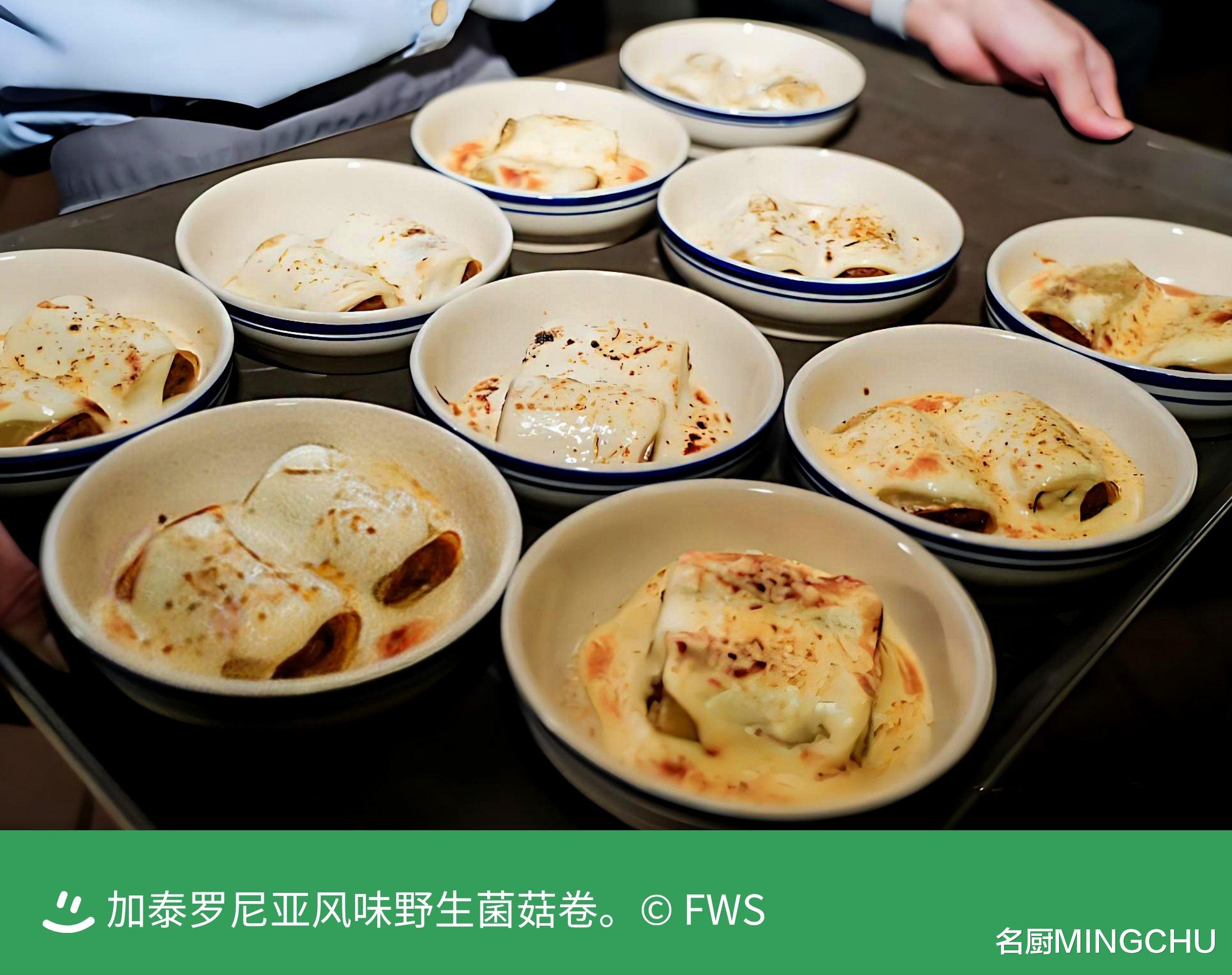 加泰罗尼亚⻛味野⽣菌菇卷将野⽣菌菇和鸭肉、猪肉等制作成卷状的内馅,外层淋上用纯牛奶熬制的酱汁,烤制而成,口感扎实且滋润。