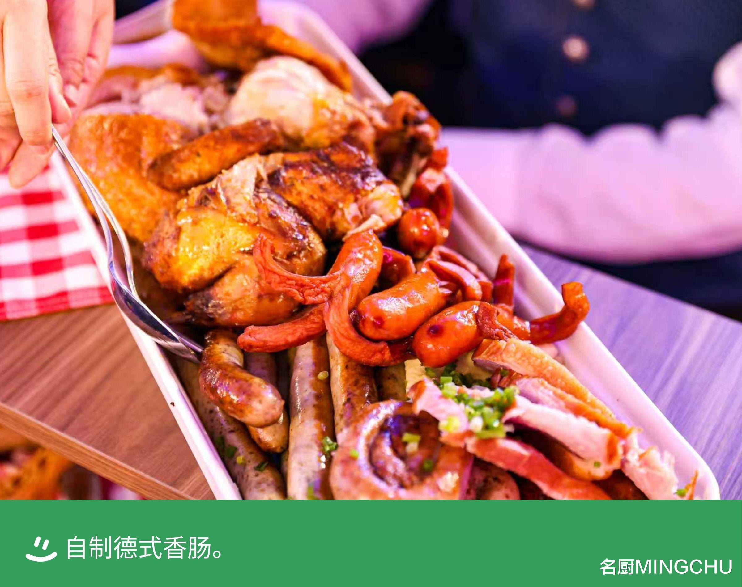 自制德式香肠餐厅多款自制经典德国香肠,包括图林根香肠、法兰克福香肠、纽伦堡香肠等。普拉那啤酒坊拥有独立的肉食专门厨房,从切肉、绞肉等原材料处理到腌制、调味、灌肠、烹饪、熏烤,均由大厨手工制作完成。遵循经典德式配方,带来地道德国风味。