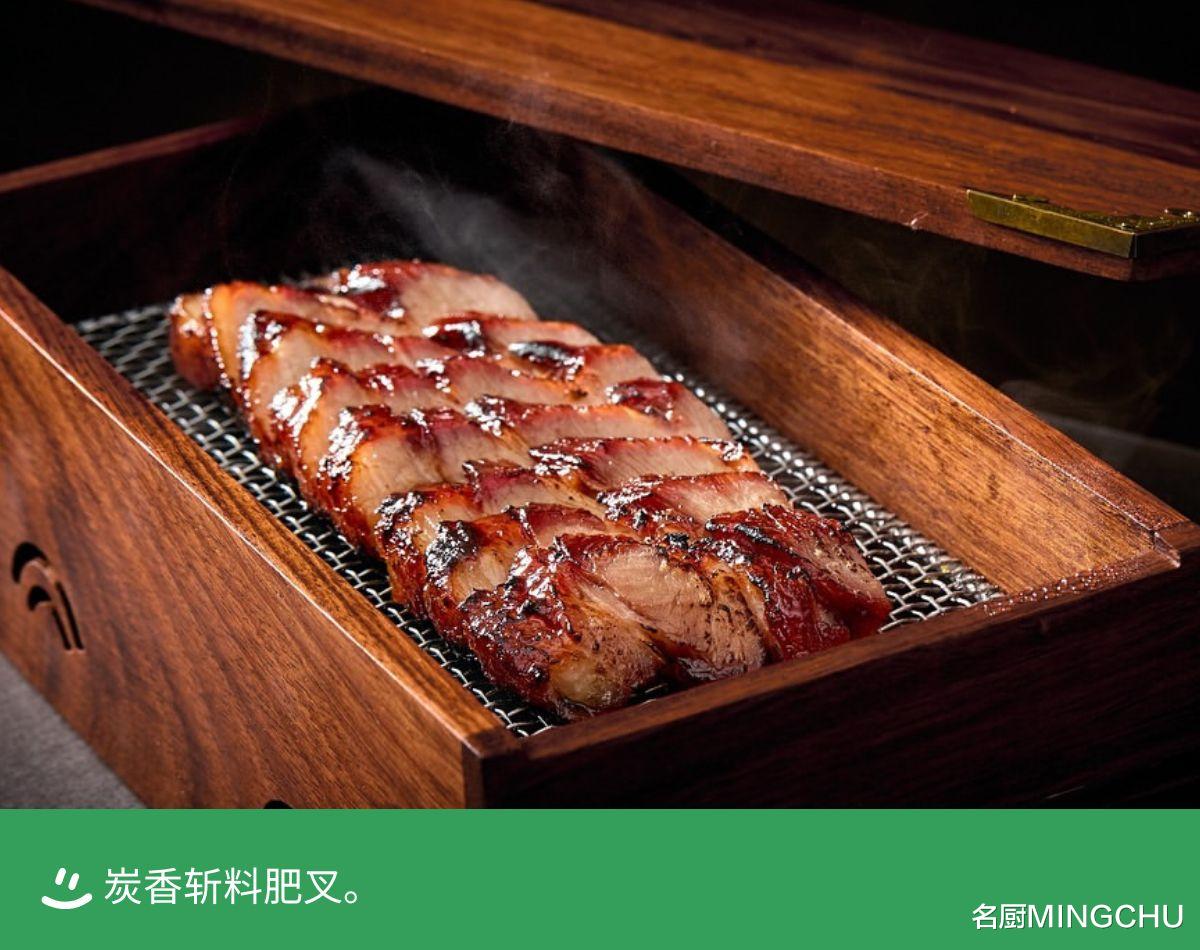 炭香斩料肥叉主厨为了重现传统烧味叉烧的经典风味,亲自走访香港八十间烧味名店,细尝各家精髓,萃取灵感,呈献记忆中道地的传统做法。选用半肥瘦叉烧,酱料浓郁醇厚,表面微焦,散发浓烈的碳香。烹调后以备长炭垫底,淋上玫瑰露提香,肉质香嫩多汁,回味无穷。