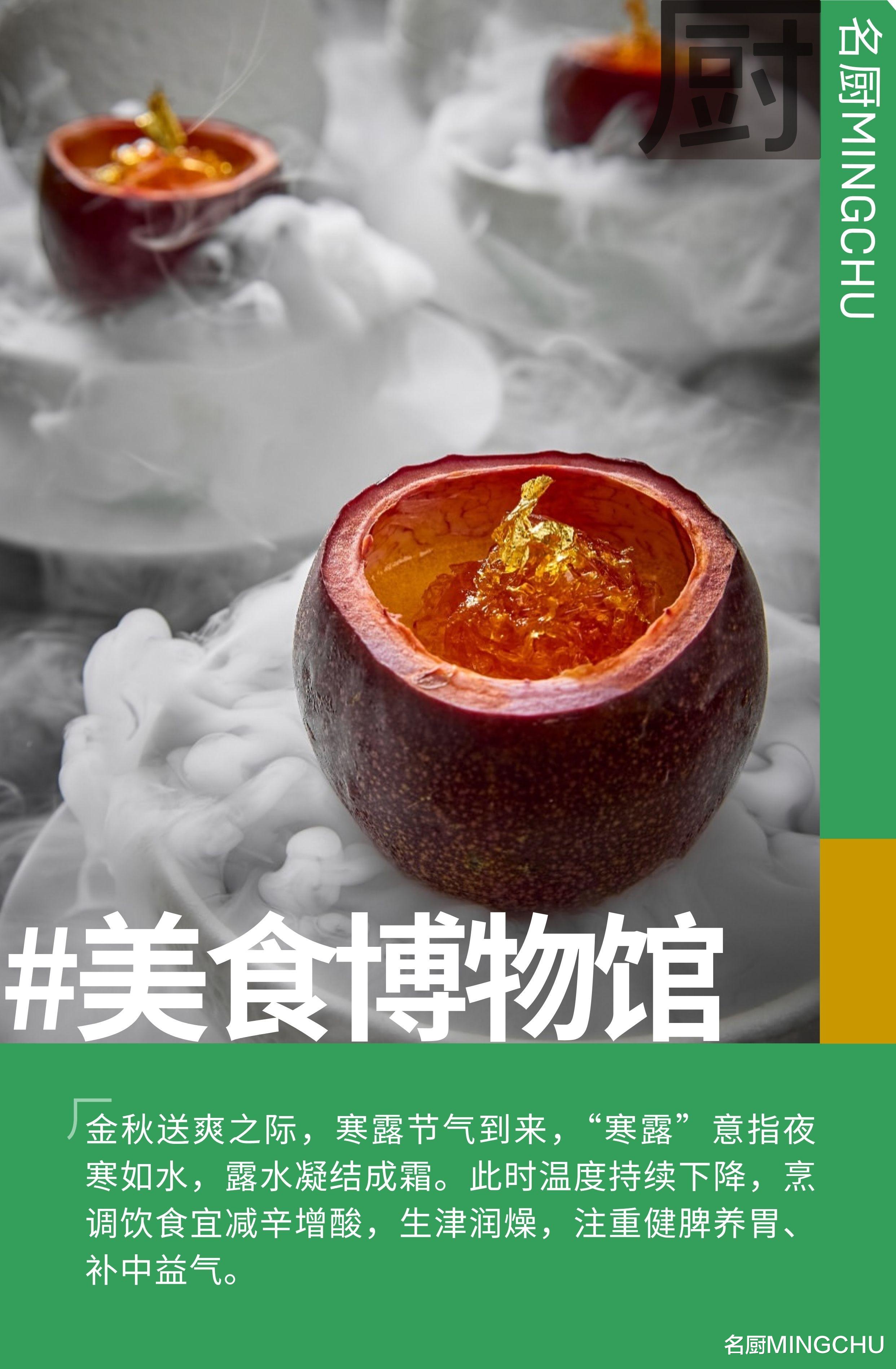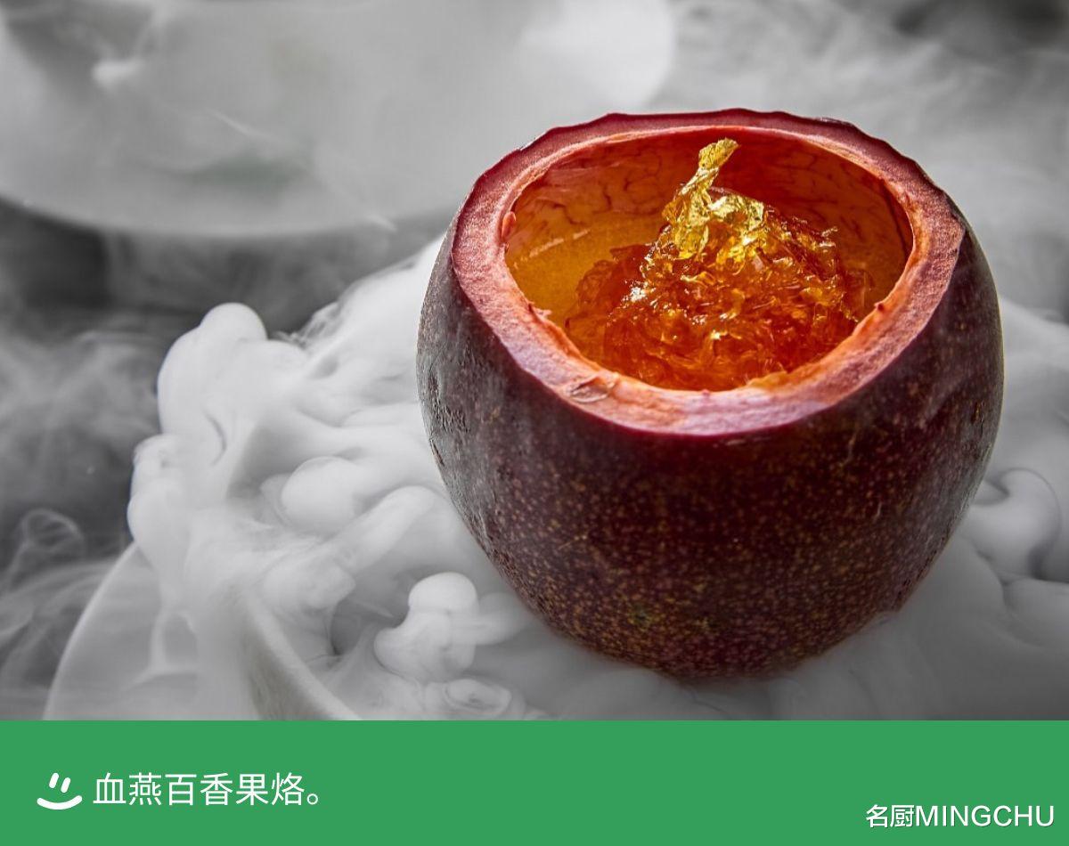血燕百香果烙这道甜品的灵感源于北京的一道红果烙——以山楂打成汁后用糖煮至浓稠,这一过程叫“烙”。主厨钟情百香果,故把两者结合。百香果汁中加入奶油、牛奶和砂糖,煮成浓稠后,放回百香果壳冰镇 3 小时,最后加入顶级的血燕盏。酸甜百香果与血燕完美融合,南北风味交汇,甜而不腻。