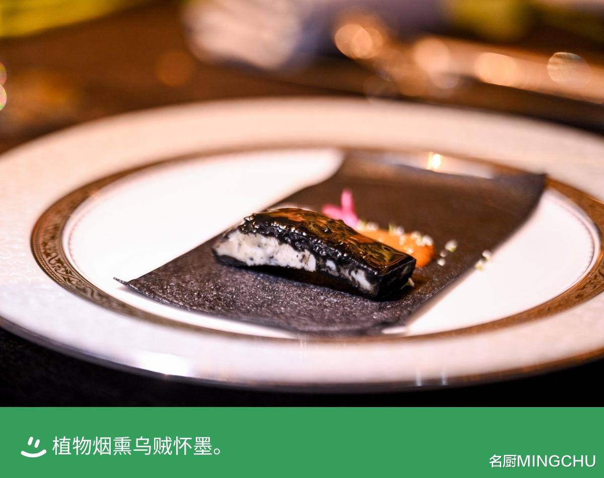 植物烟熏乌贼怀墨东海小网墨鱼,加入墨鱼汁慢炖 30 分钟,吸饱自身的醇香;再用陶木、苹果木、迷迭香、桂皮、松果熏制 30 秒,上桌前墨鱼饼用喷枪清烤加热,柏叶点缀增香,每一口都有烟熏的层次与海鲜的鲜浓。
