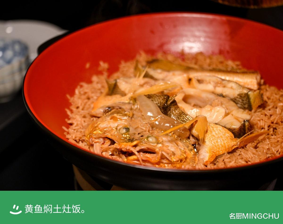 黄鱼焖土灶饭作为餐厅的招牌菜,这是一道藏着台州渔家记忆的菜:台州人靠山海为生,取山海食材为食,黄鱼焖土灶饭这道菜用家乡的传承方法传承下来,选用半山腰的晚稻米和东海黄鱼一起烹煮,是山海滋养的渔家本味。