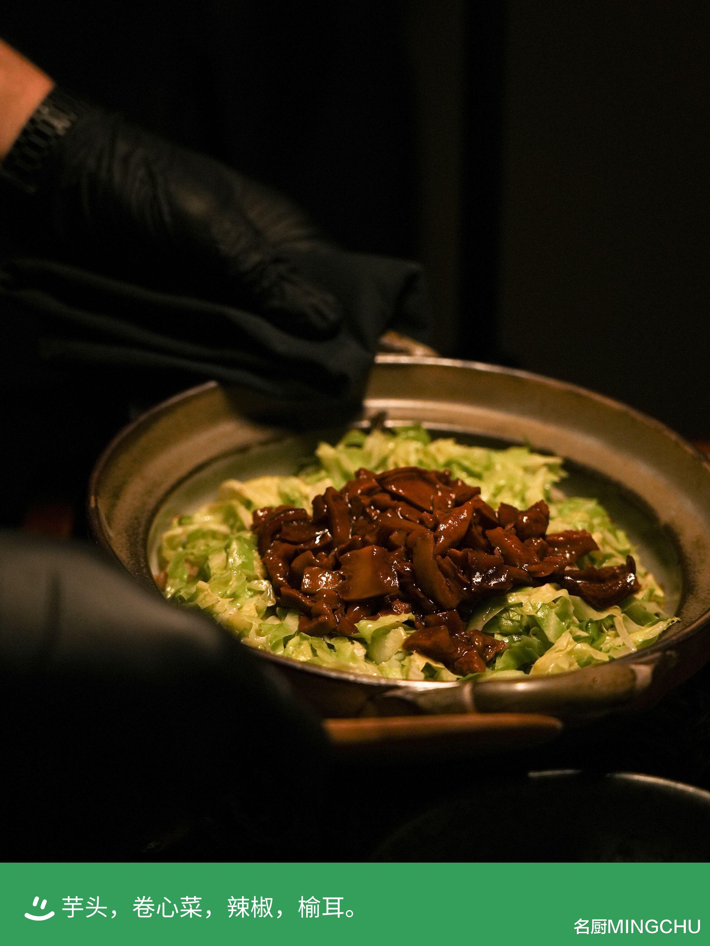 芋头,卷心菜,辣椒,榆耳这是一道家常拌(戈)饭,其实是潮汕地区迎接立冬年末时节非常传统的饮食习俗,注重“拌”和“焖”的烹饪手法。制作时,先将东北的五常大米煮熟,再和荔浦芋头、潮州菜脯一起焖制,芋头让焖饭的口感更香糯绵软。然后放入砂锅,铺上一层炒制的牛心菜和榆耳,增加米饭的清新香气。搭配的三款配料,分别是荔浦香芋丝、福建红葱酥和海苔丝,按口味适量加入饭中拌匀食用,滋味十分丰富。