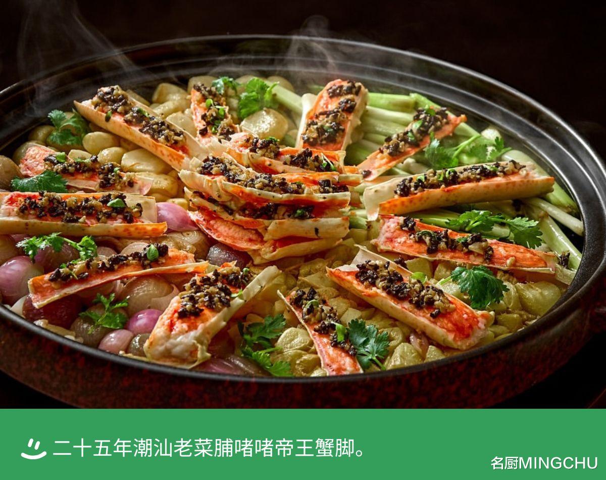 二十五年潮汕老菜脯啫啫帝王蟹脚将二十五年陈年潮汕老菜脯剁碎,与蒜茸同炒调制出浓郁的老菜脯酱。选用鲜嫩帝王蟹蟹脚,葱油爆香葱段、姜片、蒜头及干葱,炒至干香与蟹脚铺入砂煲,加上自制菜脯酱,盖上煲盖焗制五分钟,锁住鲜味。最后撒入芫荽增添清香,淋上广东米酒提味,醇香鲜甜。