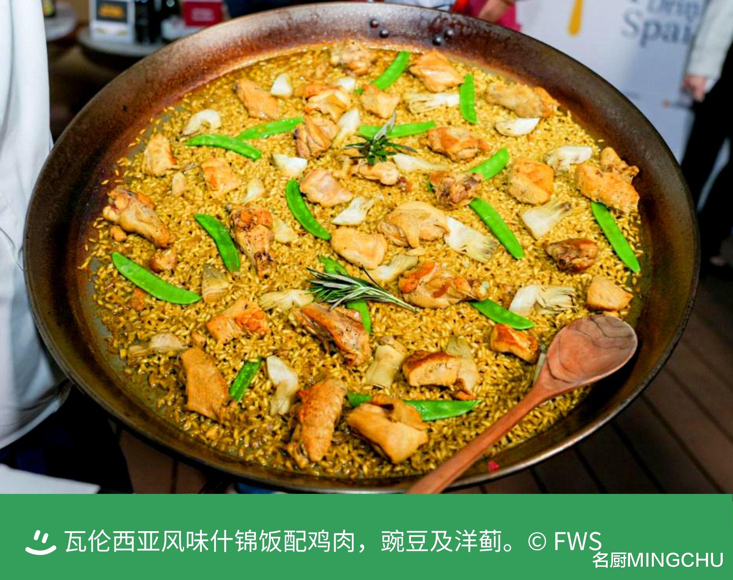 瓦伦⻄亚⻛味什锦饭配鸡⾁,豌⾖及洋蓟西班牙传统的大锅饭,可以做成很多风味,有海鲜饭、牛肉饭等。这款瓦伦⻄亚⻛味什锦饭配鸡⾁,豌⾖及洋蓟,先用特制的汤汁煮米饭,再用烤箱均匀烤制, 米饭铺在一只大平底锅上,薄薄一层, 上面有鸡块、洋蓟、豌⾖和迷迭香。米饭的烹饪时间约为 25 分钟,风味咸鲜。