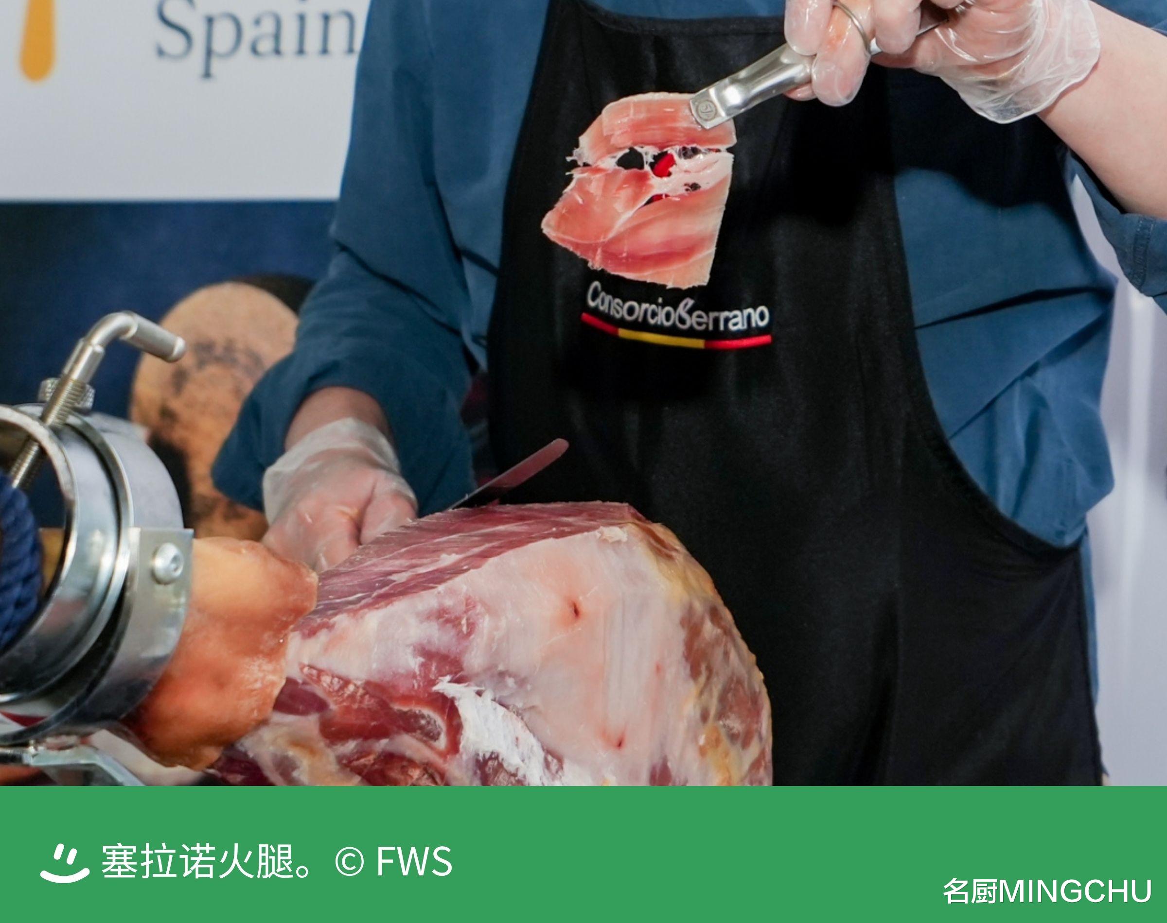 塞拉诺火腿Campofrío 与西班牙塞拉诺火腿联盟(Consorcio del Jamón Serrano Español)联袂参展,特邀中国首位认证“火腿切割大师”韩典文先生现场展演,其精妙的切割技艺吸引嘉宾们驻足观赏。塞拉诺火腿,成熟和熟化时间约为 13 个月,咸度适中,肉质丰厚饱满,带有嚼劲。