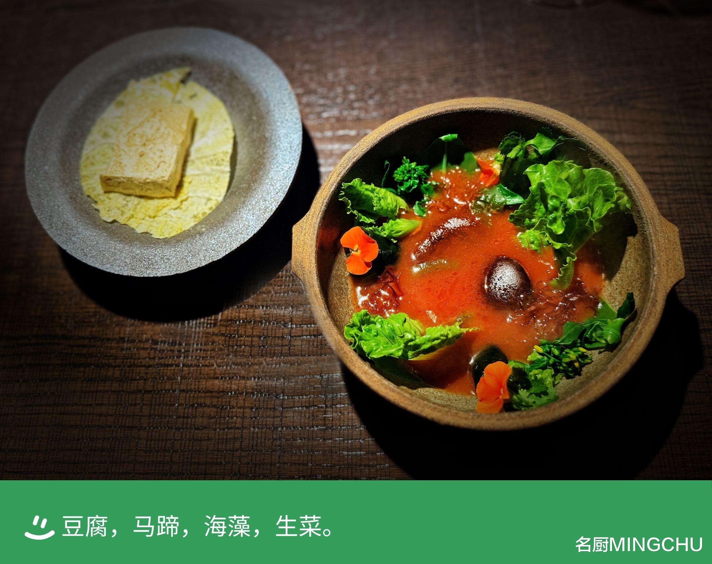 豆腐,马蹄,海藻,生菜戴师傅在这道菜品中用豆腐做了两种不同的风味表达。卤水豆腐冷冻风干,水分抽离后豆香更集中,口感更酥脆。下方铺垫的生菜也做了同样的处理。现场在放有石块的碗中倒入滚烫的酸汤,汤汁以云南的树番茄和酸木瓜发酵,再加入多种蔬菜和海藻制作而成,带出自然又有层次的酸味。品尝过冻干豆腐和生菜,剩余部分可以掰开泡在汤中,与碗中的山苏、菜心苗、裙带菜、香菜、生菜、海藻一起食用,颇为酸爽开胃。