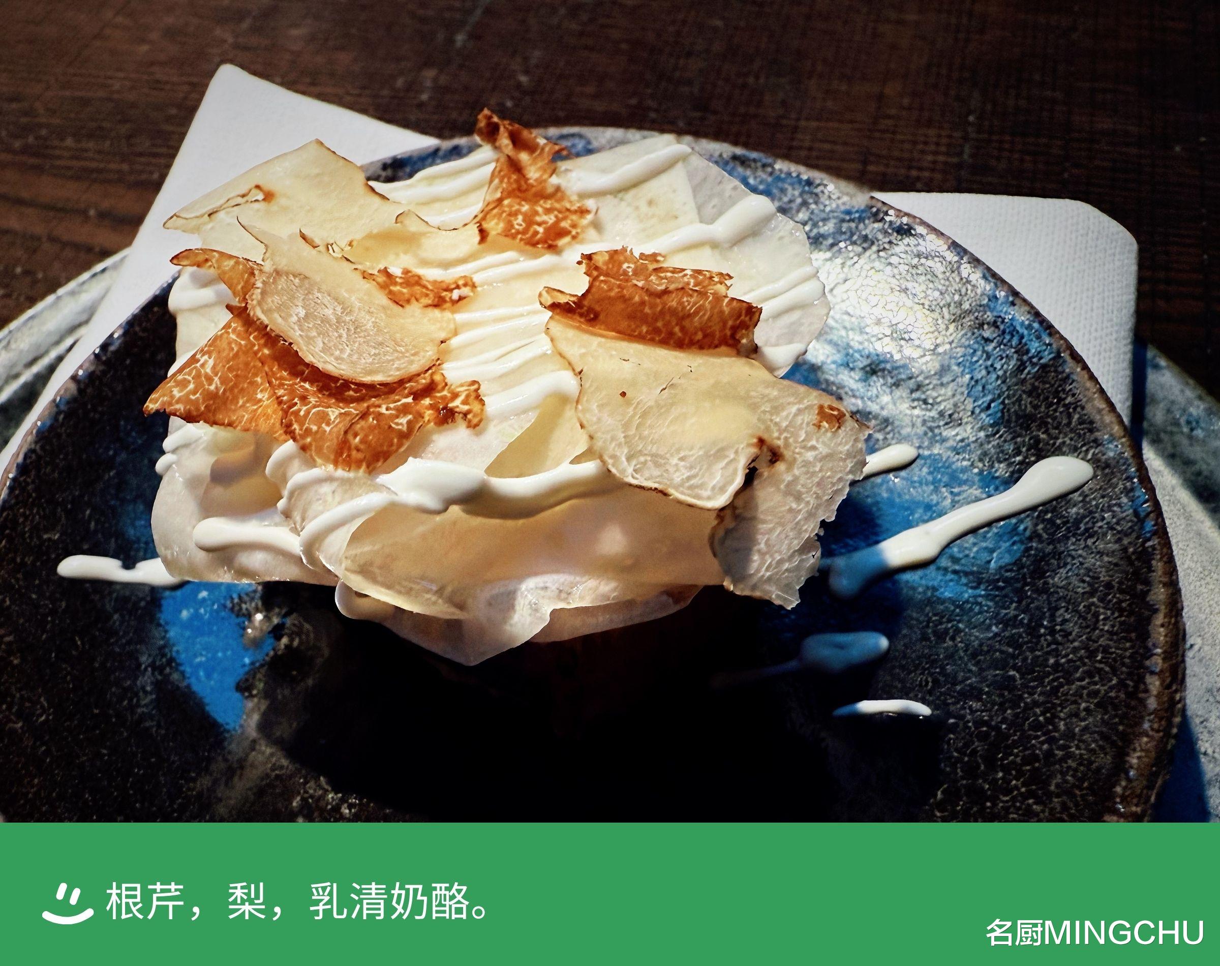 根芹,梨,乳清奶酪主料是来自于北海道的根芹,料理底部是用根芹、雪梨,还有奶酪、奶油做成的起司,形如蛋糕状,上方是用根芹制作的切片,挤上了少许青柠汁,清脆甘甜中带来一些果味酸香,顶部搭配了现刨的白松露。整体滋味香甜,奶味浓郁,口感柔软细腻。