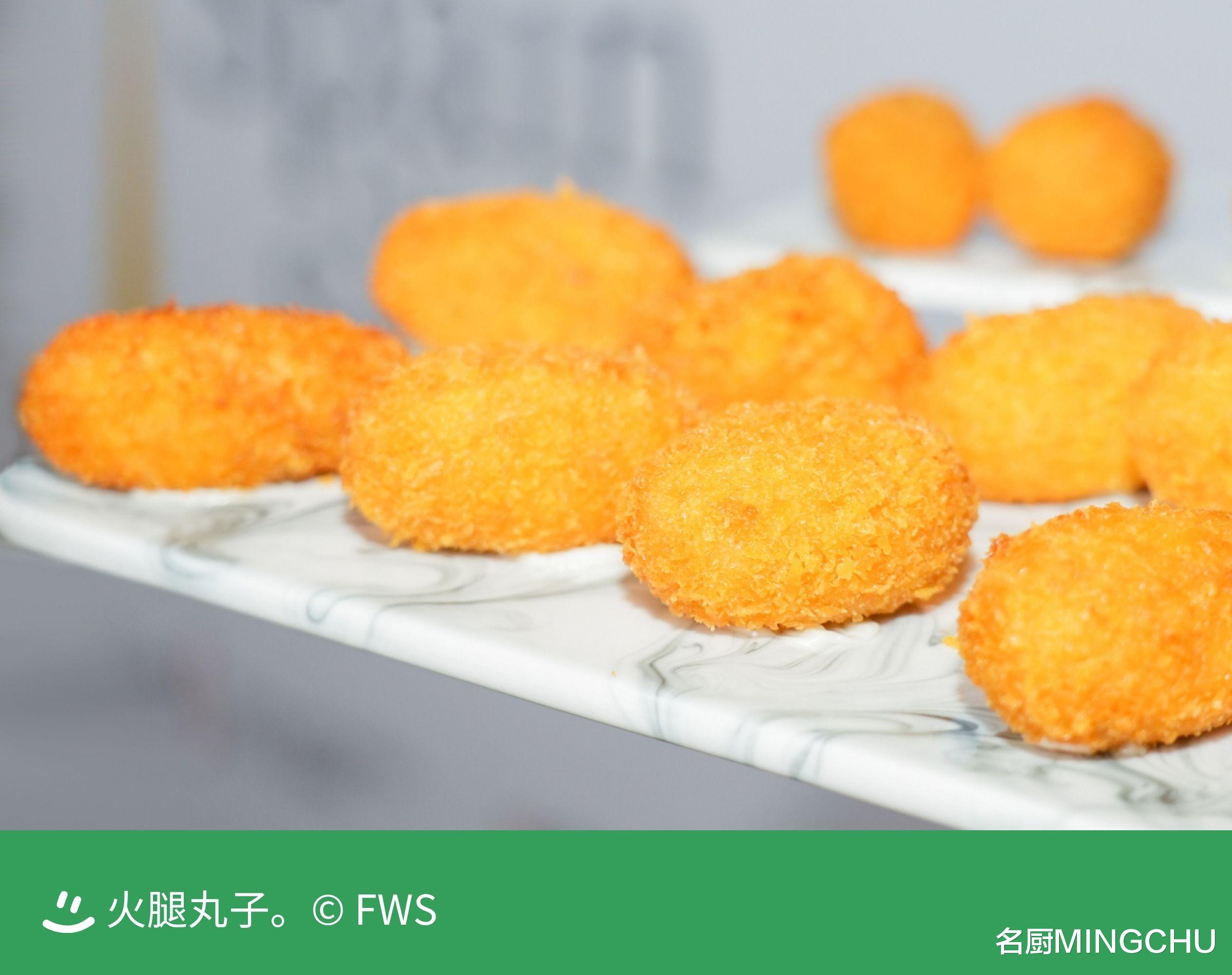 ⽕腿丸⼦⽕腿丸⼦,外酥里嫩,内部有切碎的火腿、洋葱、牛奶、面粉等,油炸制至色泽金黄。西班牙炸丸子,馅料非常丰富,可谓“万物皆可炸丸子”,在西班牙当地,还有专门制作炸丸子的餐厅。