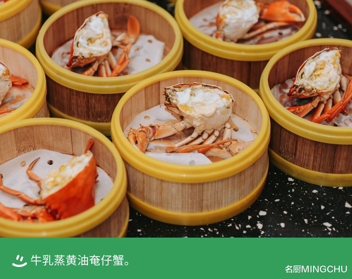 牛乳蒸⻩油奄仔蟹台山都斛青蟹此时最好的状态是⻩油奄仔蟹,蟹身橙⻩如落日,关节缝都泛金光,透光看满是油。与牛乳同蒸,蟹膏绵密,奶香四溢。