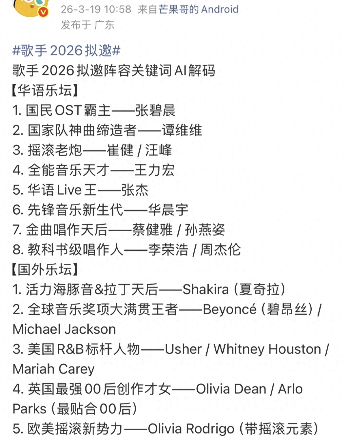 真心期待这份拟邀名单成真,坐等各位歌手同台竞技,用实力唱响舞台,让我们一起见证这场乐坛顶级盛会!