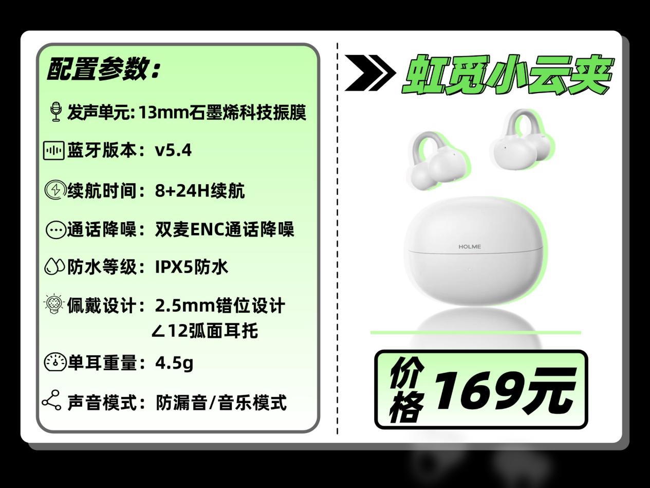虹觅小云夹air2这款耳机的性能配置也很全面。虹觅给这款耳机用上了他家自研的防漏音模式!三击按键开启防漏音模式,就能通过反向声波抵消技术,轻轻松松降低了百分之九十八的声音泄露情况,让漏音不在成为开放式耳机的痛点!耳机搭载蓝牙5.4芯片可以更好的保障设备链接稳定,还支持HBC智慧双联功能,可以将一副耳机拆分成左右耳两副耳机,同时连接两台不同的设备,把耳机的性能发挥到极致。耳机还配置了IPX5的防水等级和8+24小时的续航能力,这些功能配置非常的齐全,百元价格,千元配置,性价比超高!