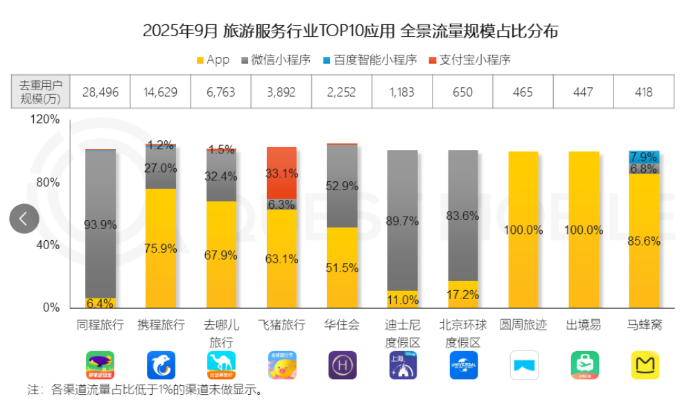 11月4日,QuestMobile发布2025中国移动互联网秋季大报告,其中提及旅游行业流量近年普涨,从各旅游平台获取旅游攻略和酒店服务成了增长趋势,多数旅游平台从微信小程序和自有APP作为获取流量渠道,仅飞猪仍从支付宝获取,马蜂窝从百度引流。