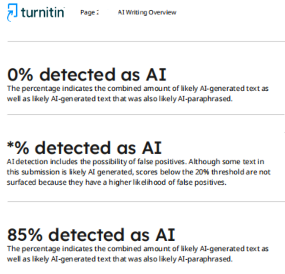 TurnitinAI检测检查后,报告会显示一个总百分比(如0%、*%、85%等),其数值含义代表本次提交的文本,被系统模型判定为可能由AI生成的文本量。这个百分比中包含有两中文本: