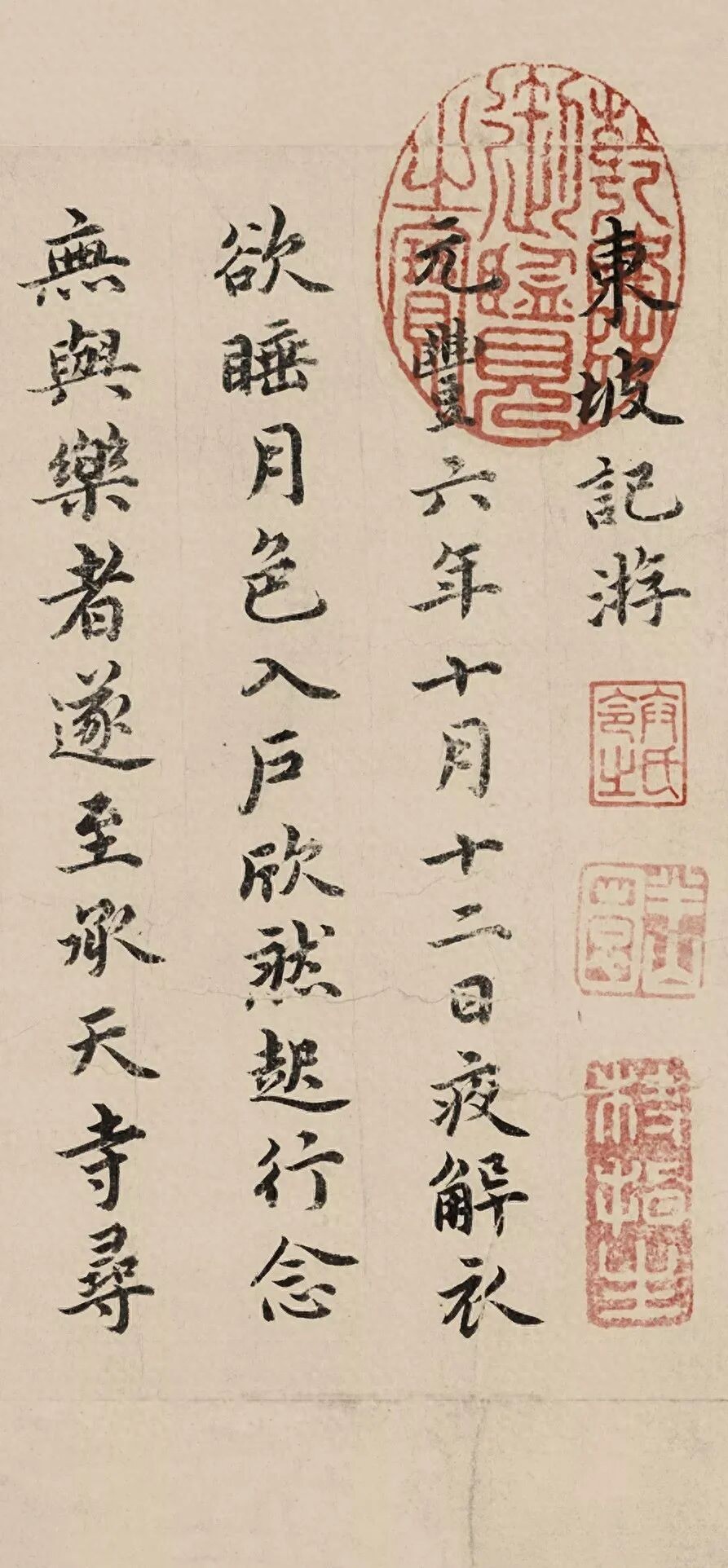 · 大小一致,整体和谐:全篇字形大小基本一致,无一字突兀,整体和谐统一。· 行气贯通,首尾呼应:从“元丰六年十月十二日夜”到“枝山祝允明”,行气贯通,笔意相连,首尾呼应。