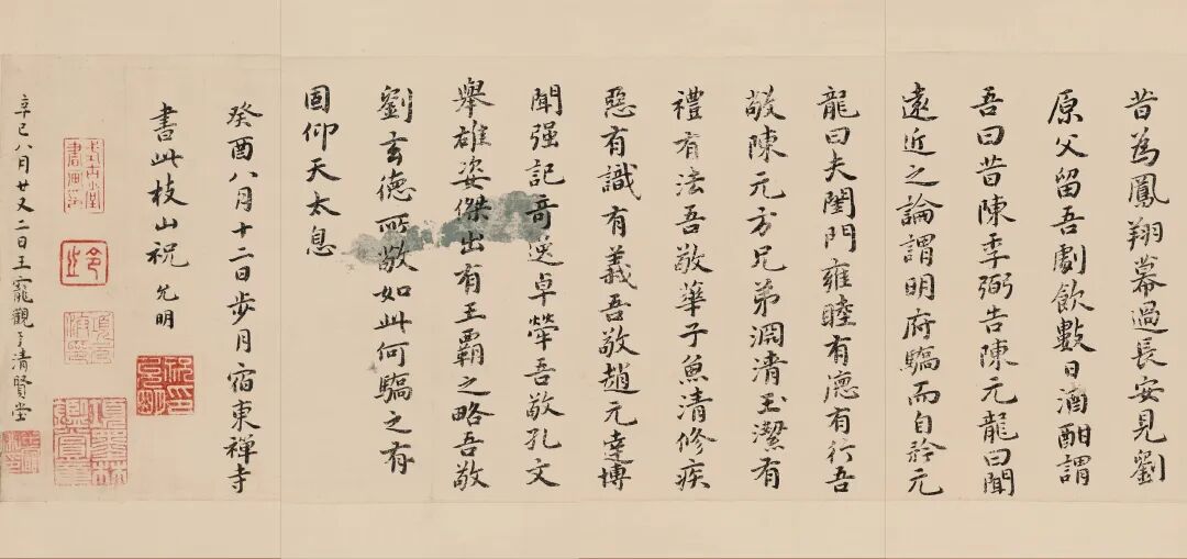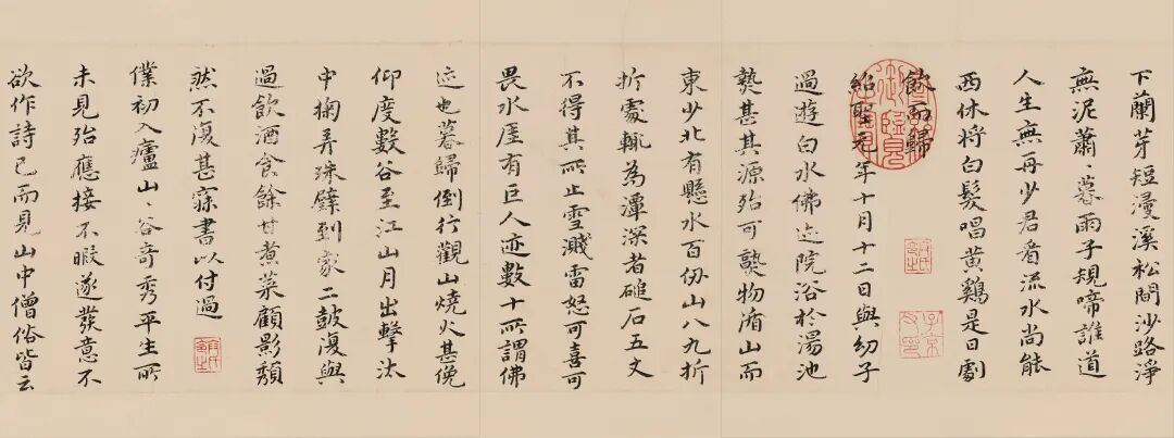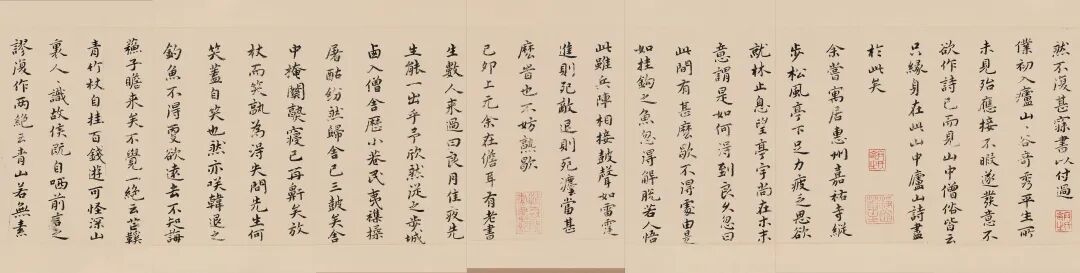 祝允明小楷《东坡记游》,一卷长卷,九篇游记,更是一卷在纸素上凝固的明代文人风雅。它以“元丰六年十月十二日夜”的闲适起笔,以“枝山祝允明”的郑重收束,在数千字之间,完成了一次对苏轼游记的深情书写,也留下了一件小楷的传世经典。