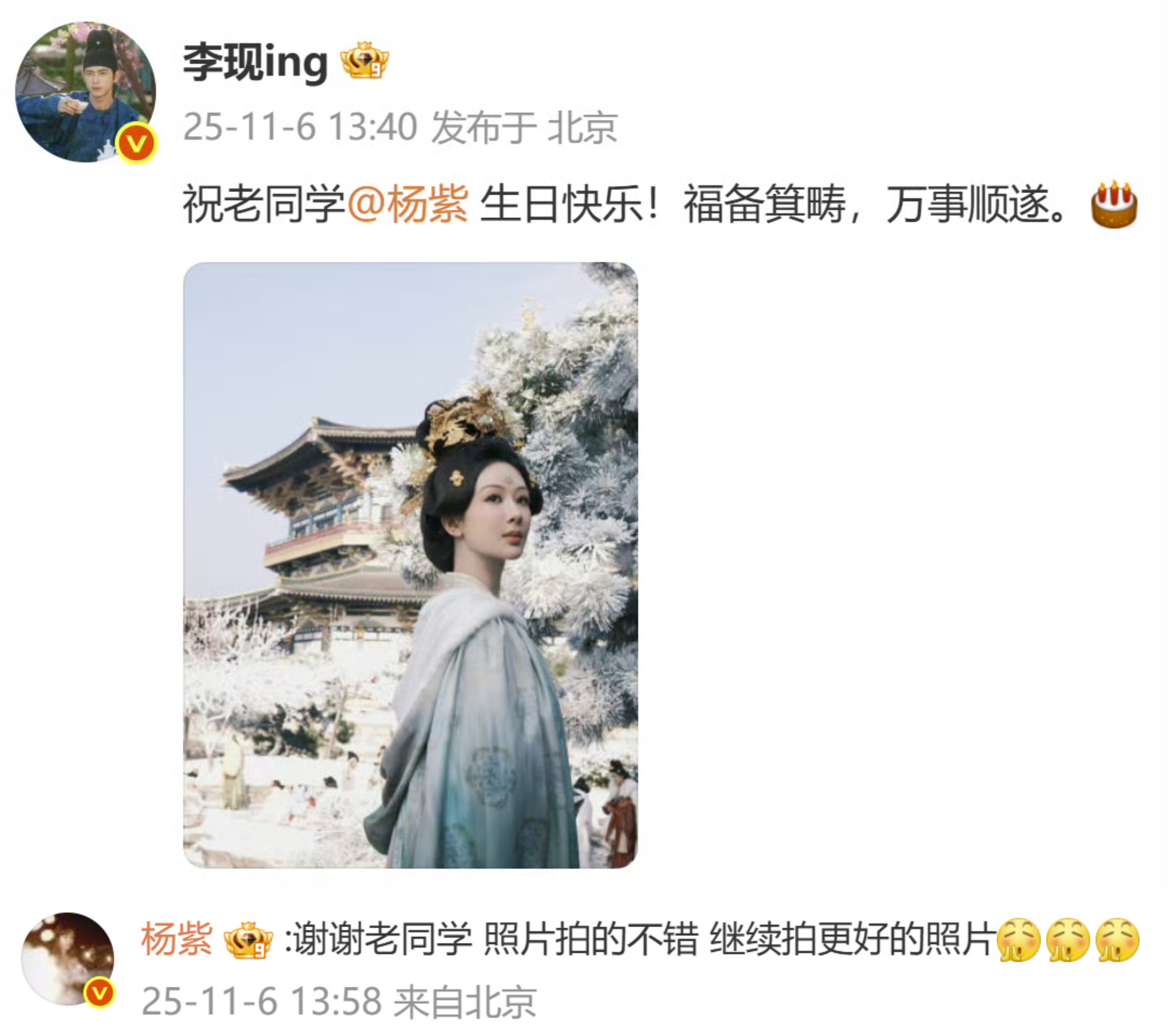 李现连续第八年为杨紫庆生,晒出了何惟芳的剧照,并配文“祝老同学杨紫生日快乐!福备箕畴,万事顺遂。”