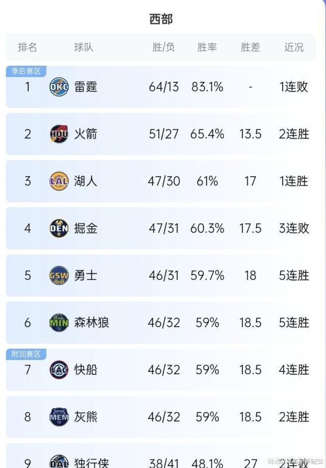 近期掘金状态低迷,已遭遇三连败,未来还将迎战步行者、灰熊和火箭等劲旅,因此他们很可能无法达成50胜的目标。如果湖人在与雷霆的比赛中被双杀,而快船在最后一场比赛中击败勇士,那么快船和勇士的战绩将同为50胜32负。由于快船在双方交手中占据优势,他们将超越勇士,排名更靠前。