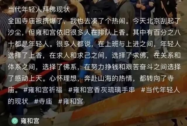 上香、拜佛、烧香、许愿、求保佑、拜神仙、磕头、祈祷......各种跟宗教有关的活动,都成了年轻人“卷”进去的对象。他们把情感的宣泄构建在寺庙、教堂、道观等宗教场所及其象征物上,希望得到心灵慰藉和精神寄托。有的则是到寺庙里点上香烛,嘴里念叨着“保佑我今年顺利找到工作”。