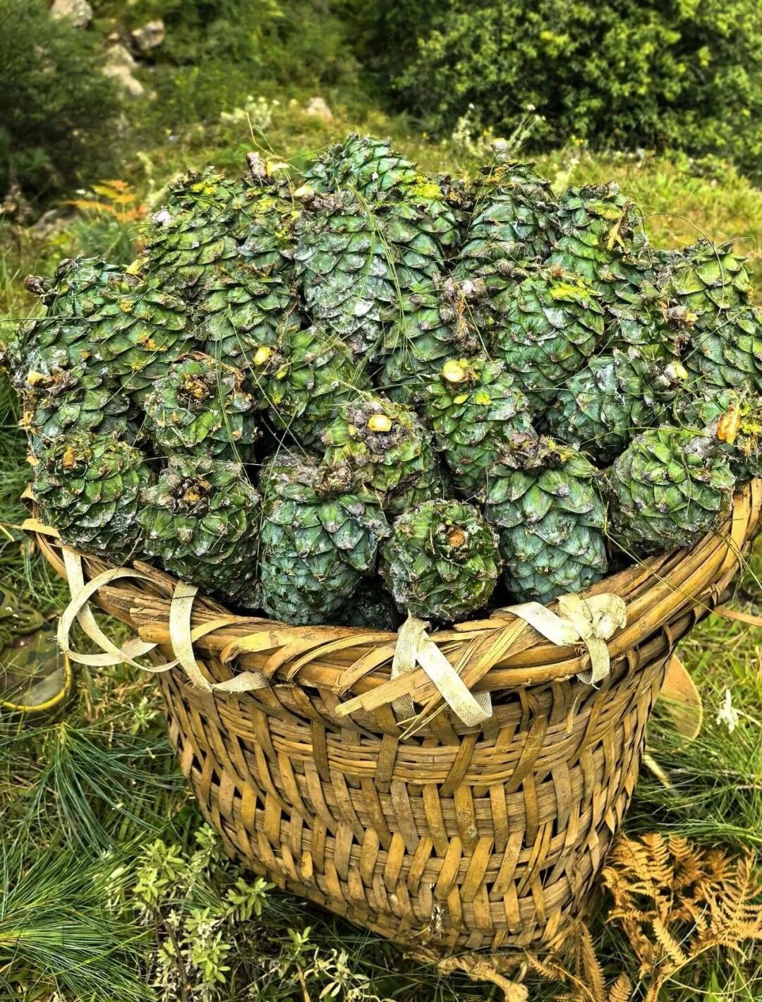 眼下正是摘松子的黄金时节,山间的雾气还未散尽,农户们便背着背篓、腰间别着镰刀上山了。有些华山松长在悬崖峭壁边缘,树干笔直地伸向天空,主家需脚踩树瘤、手抓枝干,一点点向上攀爬,脚下是深不见底的山涧,危险系数极高,但每当看到枝头挂满沉甸甸的松塔,那份对丰收的期待便压过了所有恐惧。爬到合适位置后,他们抽出镰刀,对准结满松塔的枝桠果断砍下,松塔顺着树干滚落,在山间发出 “咚咚” 的声响。待整棵松树的松塔都被收割完毕,主家才小心翼翼地下树,将散落的松塔一个个捡拾起来,装满背篓后,背着这份沉甸甸的收获下山。