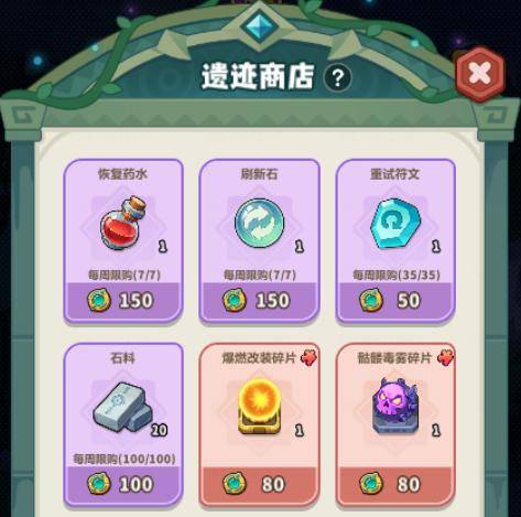 兑换体系:玩家可使用 “遗迹币” 在专属商店兑换物品,包括机关碎片以及关卡实用道具(如回血药水、恢复失败次数)。